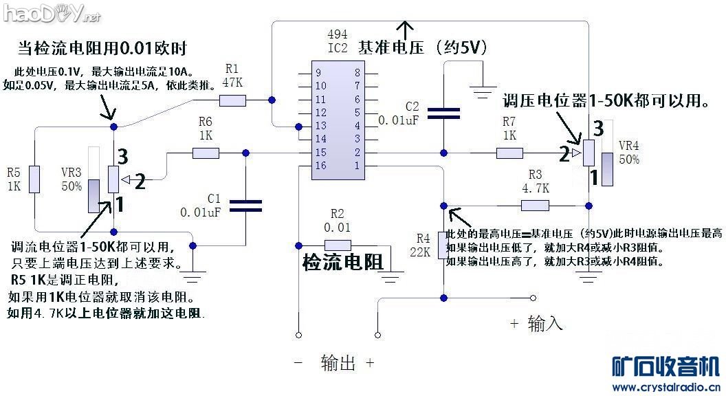 一、电源指标 做了多种电压的版本,有不改变压器的二种电源,即0-25V和0-46V,还有改变压器和重绕变压器自动切换高低压接线的100V电源,现在放出制作最方便,线路最成熟不改变压器的二种电源,多了要乱。 1、电压0-25V可调、0-46V桥式整流可调。 2、电流25V的0-8A可调、46V的0-5A可调。 3、带CV、CC指示。 4、输出波纹P-P在50毫伏以下。 5、有缓开机功能。 二、电源材料 1、ATX电源一台。 2、多圈电位器二只(1K-20K都可以用)。 3、电压电流表一只。 4、0.01欧5W电阻一只。 5、输出滤波电容一只3300-6800UF都可以,25V用耐压35V,46V用耐压63V。 6、高速整流阳管一只,46V电源用(如MUR1620R),25V电源只要用原机的12V整流管(如1620CT),就是耐压200V高速管,绝对不能用耐压45V的肖特基管(如4045管)。 三、电源原理图 1、以长城电源为版本的原理图,0-25V和0-46V通用,只要调整和加几个元件。 ![]() 2、辅助原理图。 ![]() 四、电源PCB 二种电压电源用一种PCB板。 ![]() ![]() ![]() ![]() 1、0-25V电源。 ![]() 2、0-46V电源与25V电源不同点。 ![]() ![]()