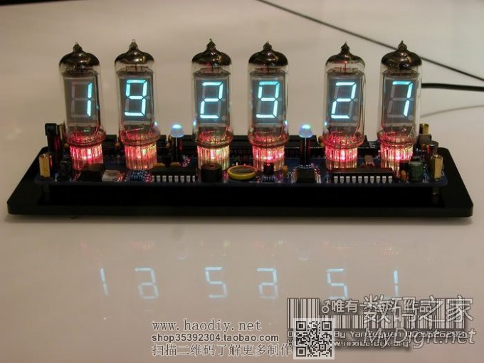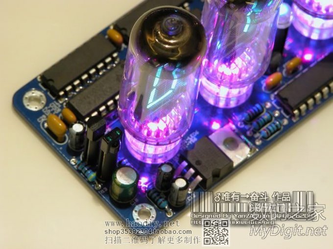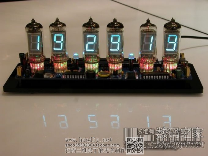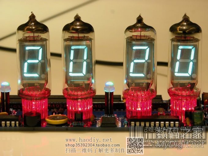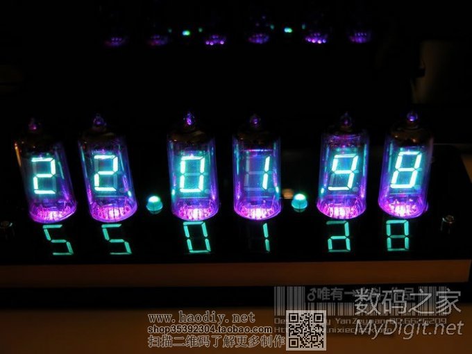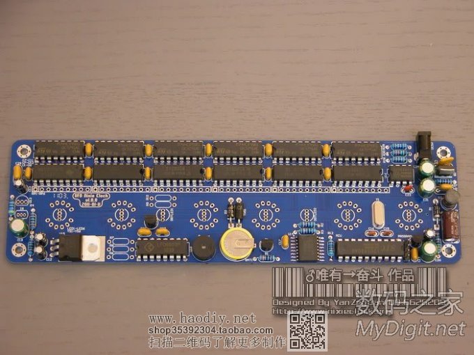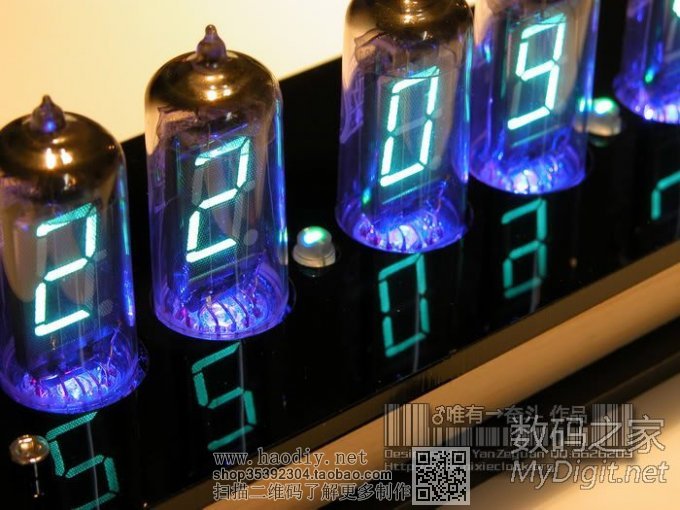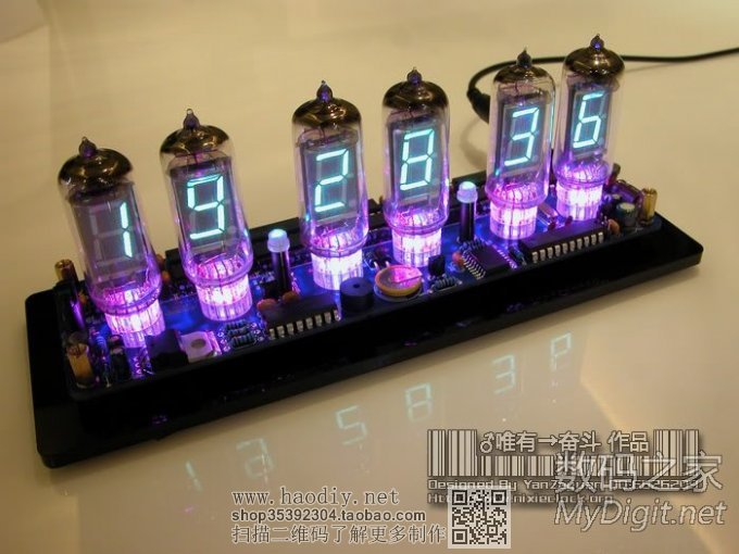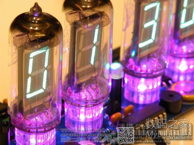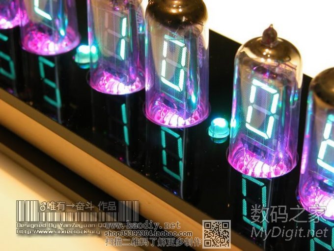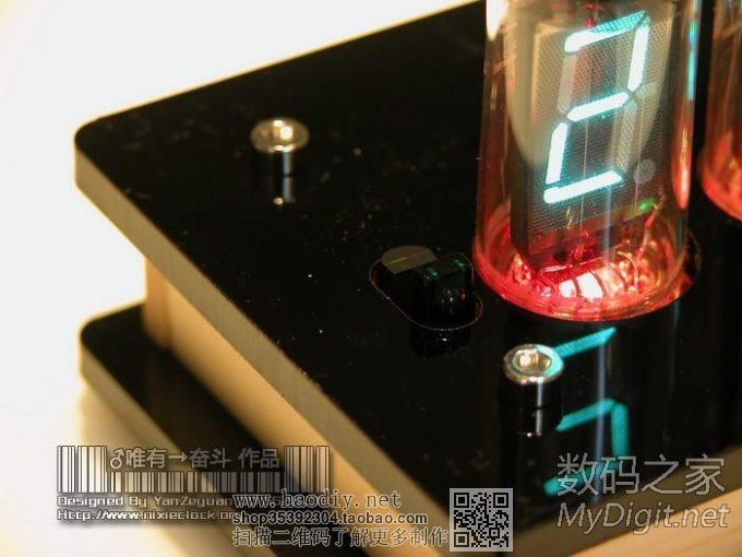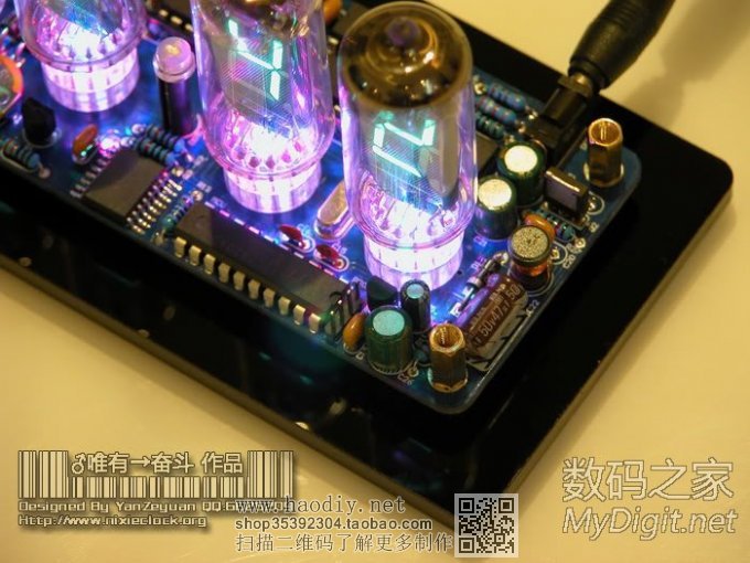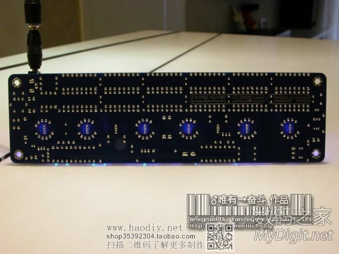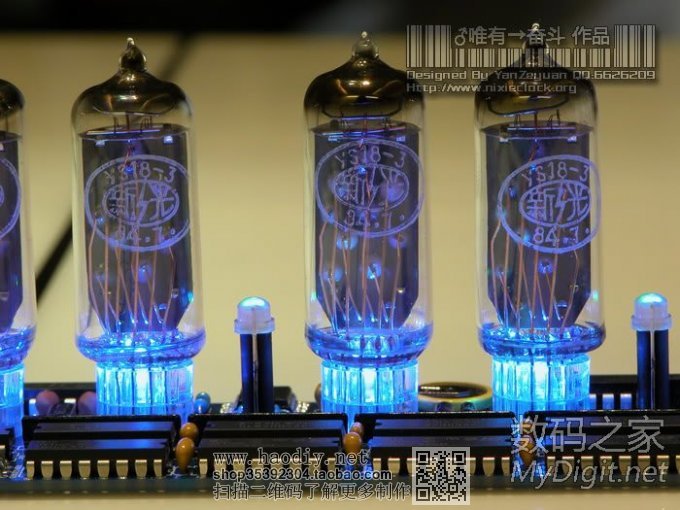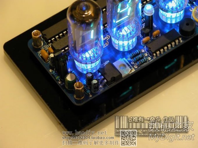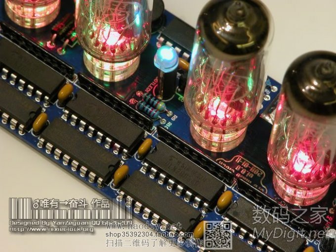 同样是采用了近30年前的一种电子管--VFD荧光数码电子管,虽然是80年代初生产,比起辉光管晚出了几年,但漂亮通透的玻璃管身依然放射出一种古典的韵味,同时又焕发着一种现代的气息。 VFD荧光的原理比起辉光管来说有本质上的不同,驱动也采用了低电压(VFD荧光管只需20v就能驱动,辉光管最低需要170v的阳极高压)。这次采用的是YS18-3的荧光数码电子管,尺寸与我以前设计的QS18-12的辉光电子管相同,直径为18mm。虽然尺寸相同,但是荧光管的顶部都有银色的消气剂,就像戴了一顶银色的帽子,很漂亮。 由于全部采用直插元件,所以电子管本身需要架高,所以专门用激光雕刻了专用的管座将荧光管垫高,同时能够折射出位于管底的RGB LED所发出的炫彩背景光。刚才提过,所有的元器件高度均在10mm一下,但是有四个元器件需要伸出:两只用于代替时钟冒号的LED,专门订购了14mm高的支撑柱将其撑起,还有一只红外线接收头,也用14mm高的专用支撑住将其撑起,还有一只温度传感器18B20,因为它的管脚短,所以专门订购了12mm高的支撑住撑起。 所有器件布局合理,没有飞线,没有感觉器件的稀疏与拥挤。即使不用外壳,同样能给人电子器件构成的美感。 SHOW一下: