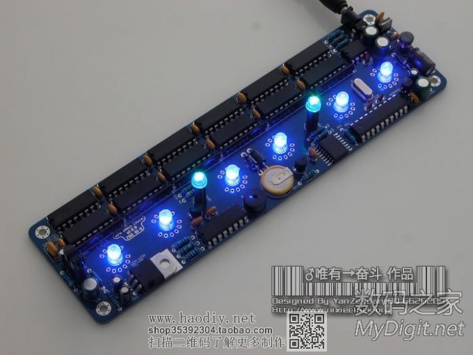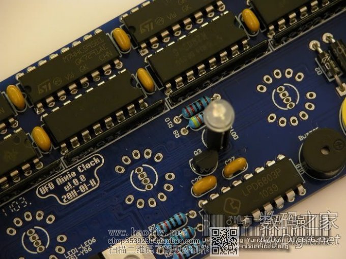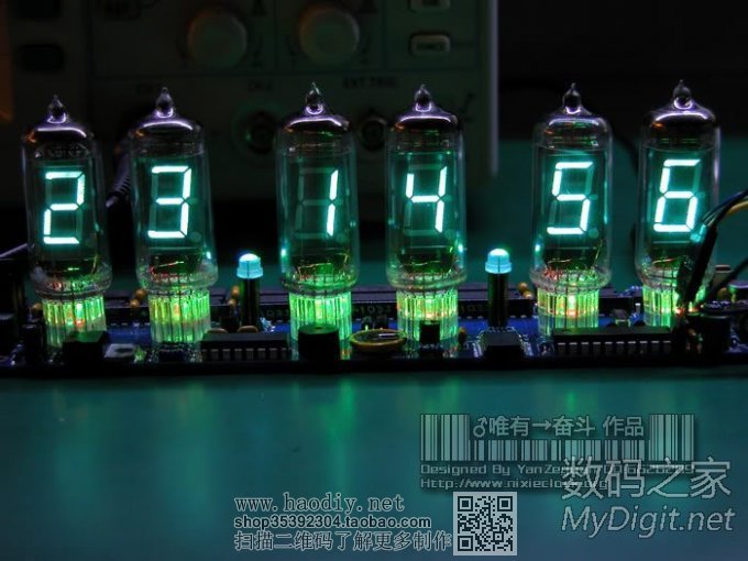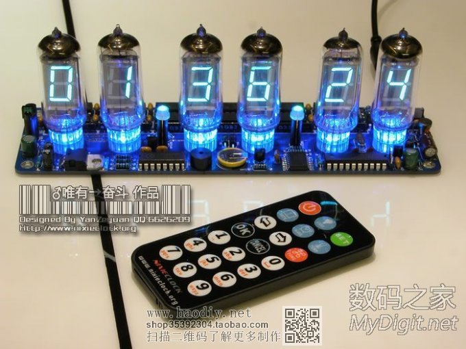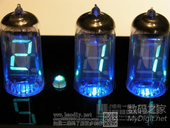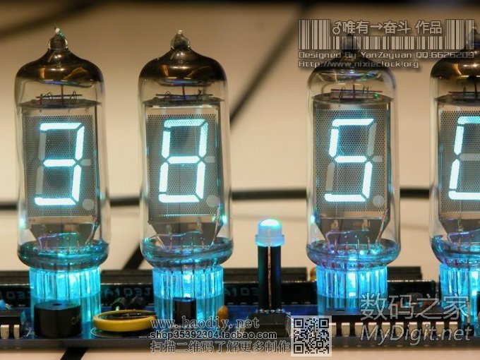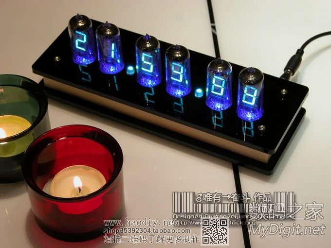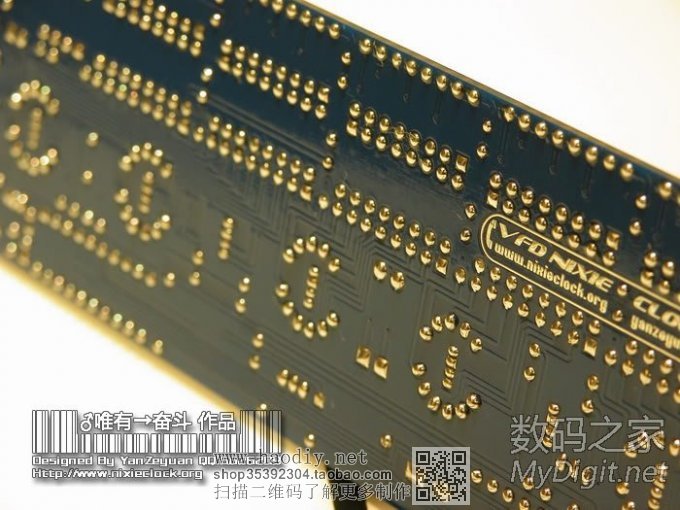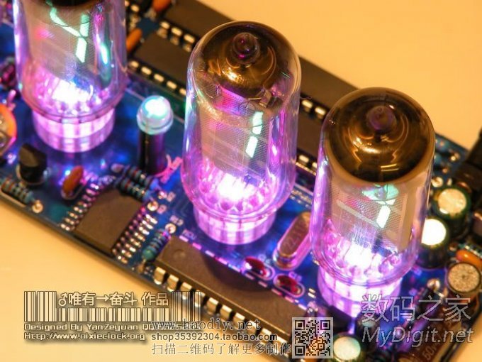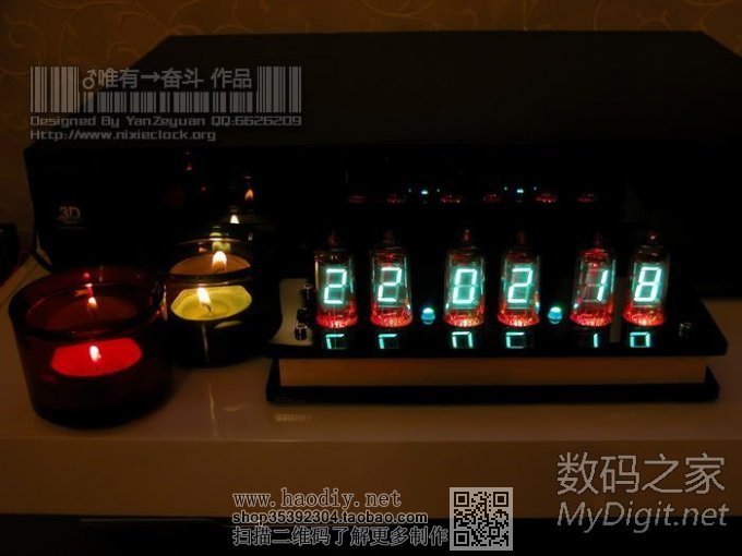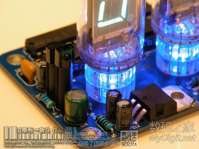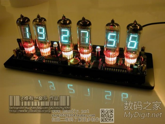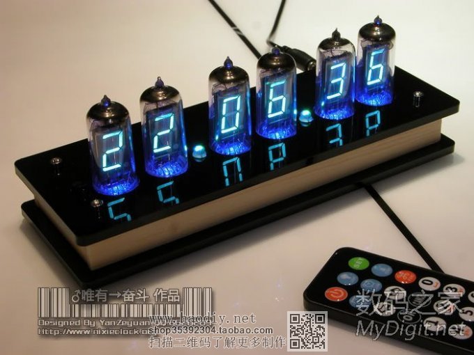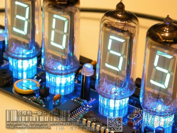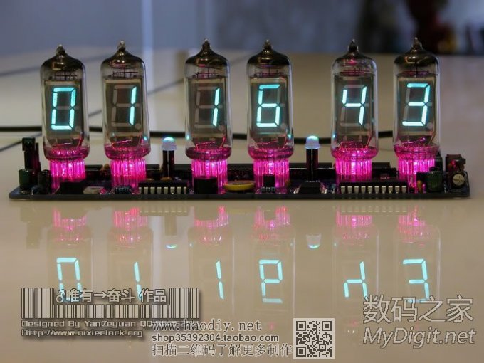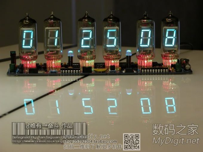 同样是采用了近30年前的一种电子管--VFD荧光数码电子管,虽然是80年代初生产,比起辉光管晚出了几年,但漂亮通透的玻璃管身依然放射出一种古典的韵味,同时又焕发着一种现代的气息。 VFD荧光的原理比起辉光管来说有本质上的不同,驱动也采用了低电压(VFD荧光管只需20v就能驱动,辉光管最低需要170v的阳极高压)。这次采用的是YS18-3的荧光数码电子管,尺寸与我以前设计的QS18-12的辉光电子管相同,直径为18mm。虽然尺寸相同,但是荧光管的顶部都有银色的消气剂,就像戴了一顶银色的帽子,很漂亮。 由于全部采用直插元件,所以电子管本身需要架高,所以专门用激光雕刻了专用的管座将荧光管垫高,同时能够折射出位于管底的RGB LED所发出的炫彩背景光。刚才提过,所有的元器件高度均在10mm一下,但是有四个元器件需要伸出:两只用于代替时钟冒号的LED,专门订购了14mm高的支撑柱将其撑起,还有一只红外线接收头,也用14mm高的专用支撑住将其撑起,还有一只温度传感器18B20,因为它的管脚短,所以专门订购了12mm高的支撑住撑起。 所有器件布局合理,没有飞线,没有感觉器件的稀疏与拥挤。即使不用外壳,同样能给人电子器件构成的美感。 SHOW一下: