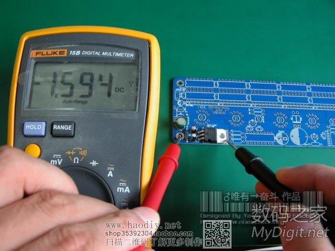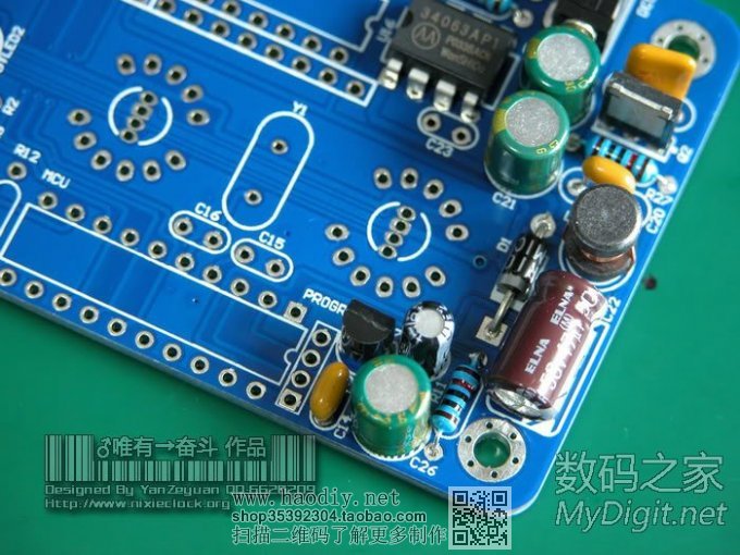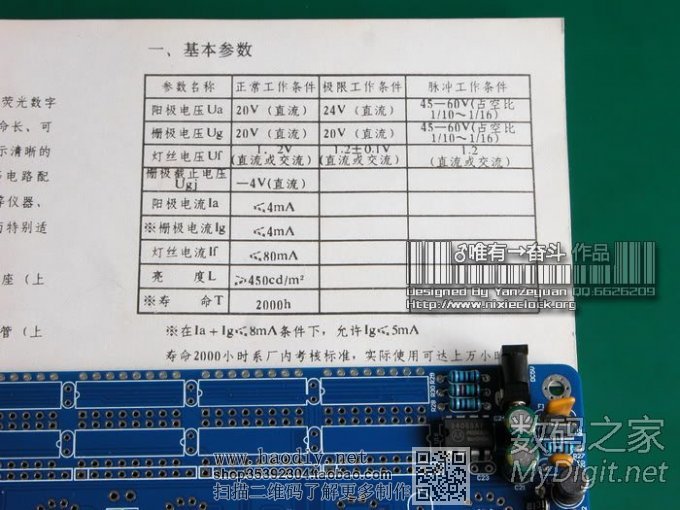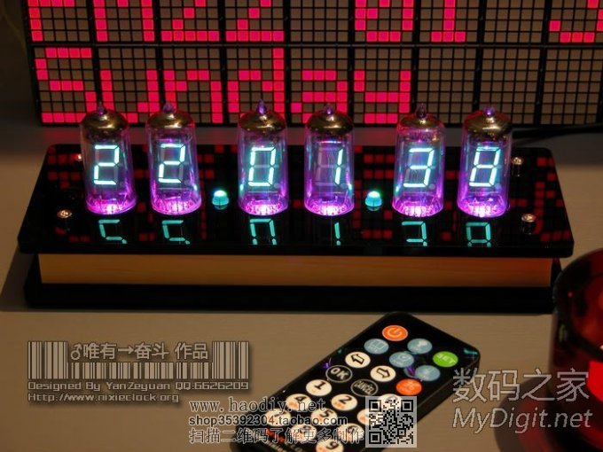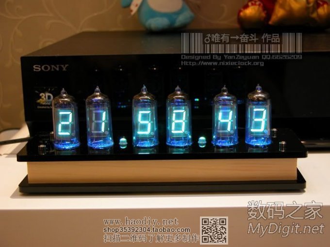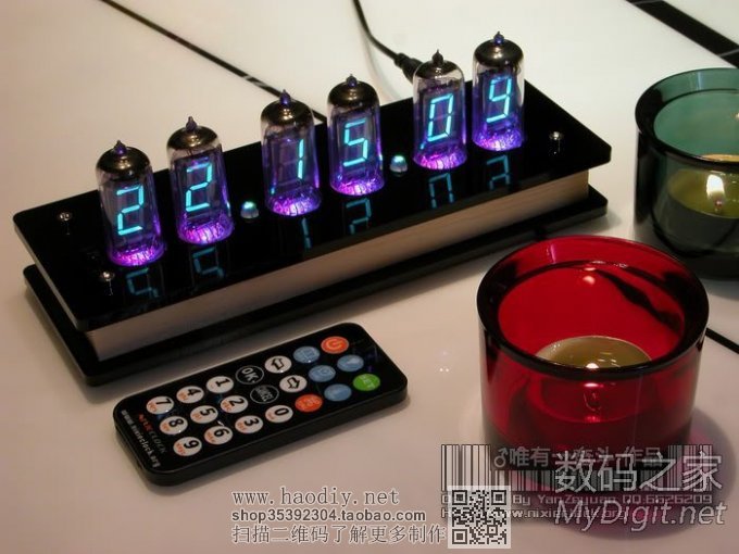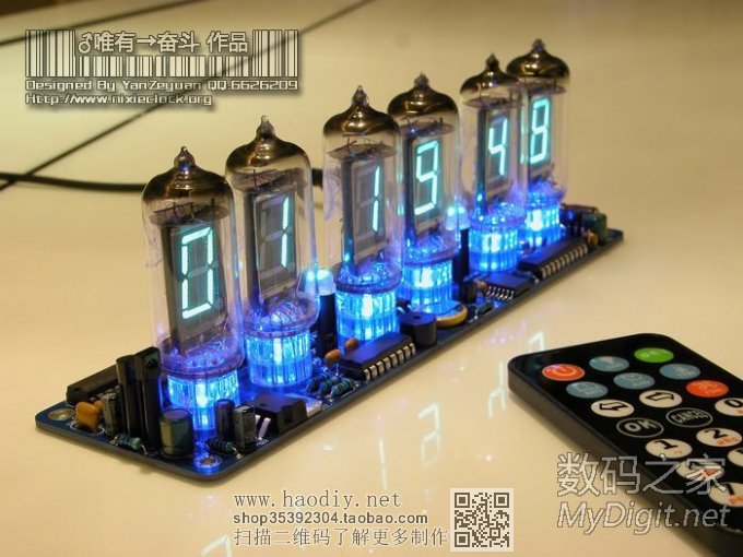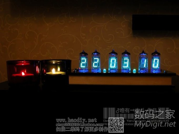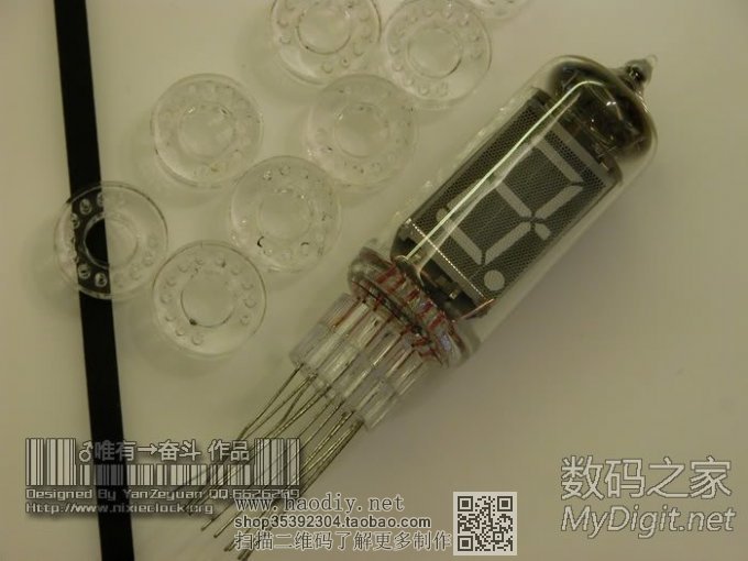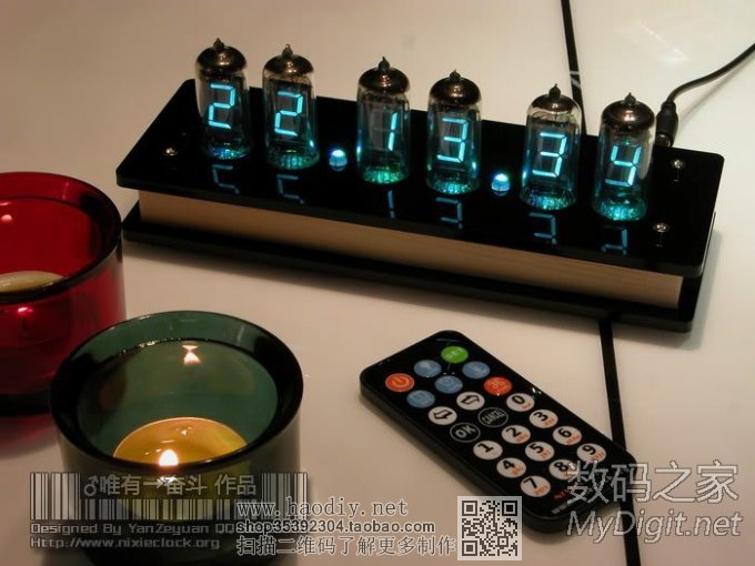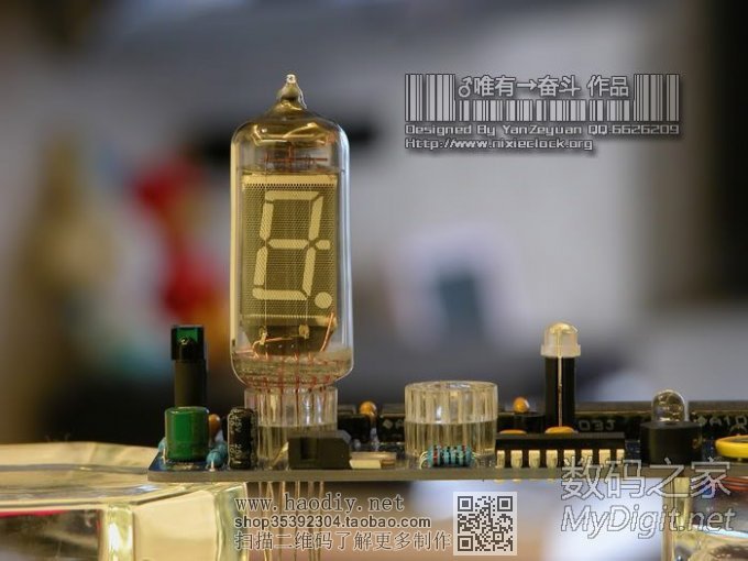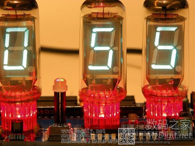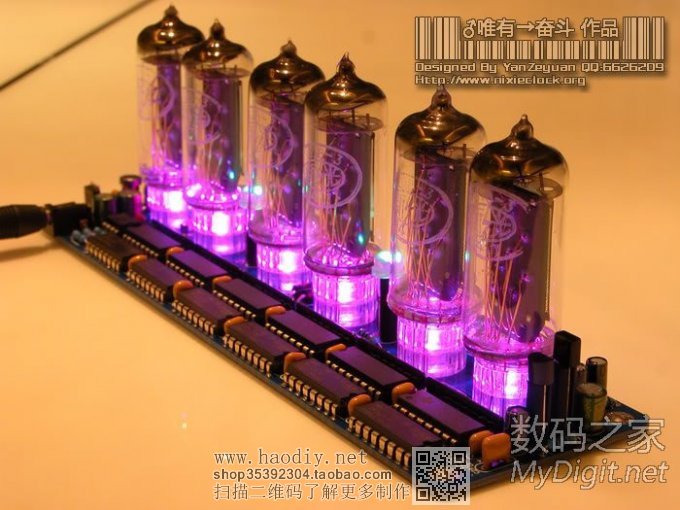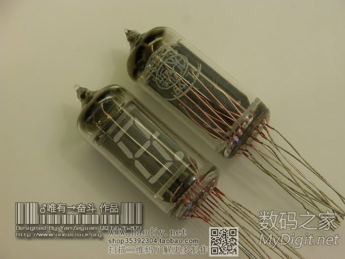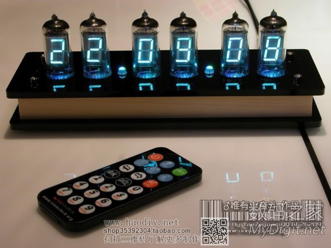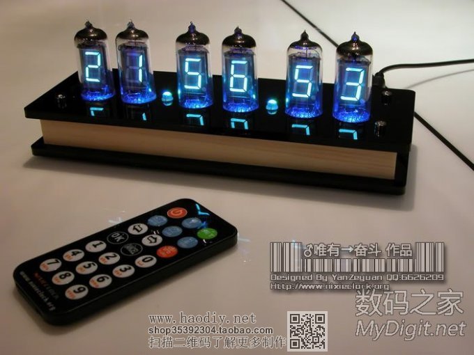 同样是采用了近30年前的一种电子管--VFD荧光数码电子管,虽然是80年代初生产,比起辉光管晚出了几年,但漂亮通透的玻璃管身依然放射出一种古典的韵味,同时又焕发着一种现代的气息。 VFD荧光的原理比起辉光管来说有本质上的不同,驱动也采用了低电压(VFD荧光管只需20v就能驱动,辉光管最低需要170v的阳极高压)。这次采用的是YS18-3的荧光数码电子管,尺寸与我以前设计的QS18-12的辉光电子管相同,直径为18mm。虽然尺寸相同,但是荧光管的顶部都有银色的消气剂,就像戴了一顶银色的帽子,很漂亮。 由于全部采用直插元件,所以电子管本身需要架高,所以专门用激光雕刻了专用的管座将荧光管垫高,同时能够折射出位于管底的RGB LED所发出的炫彩背景光。刚才提过,所有的元器件高度均在10mm一下,但是有四个元器件需要伸出:两只用于代替时钟冒号的LED,专门订购了14mm高的支撑柱将其撑起,还有一只红外线接收头,也用14mm高的专用支撑住将其撑起,还有一只温度传感器18B20,因为它的管脚短,所以专门订购了12mm高的支撑住撑起。 所有器件布局合理,没有飞线,没有感觉器件的稀疏与拥挤。即使不用外壳,同样能给人电子器件构成的美感。 SHOW一下: