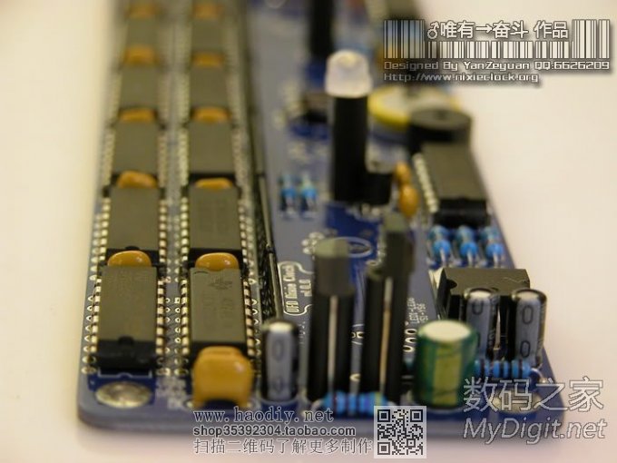 我接触电子的时候,几乎是直接从SMD上手的,所以一直以来对SMD情有独钟。因为现代电子工艺带给我们的是集成度越来越高的零部件,可以满足我们在尽可能小的空间内完成更多更精彩的功能,所以前面几个时钟作品包括LED点阵、辉光管、VFD点阵全部都采用SMD器件设计并制作。 后来慢慢接触了很多老的工控产品发现原来ALL DIP的电路板也能如此唯美,比如20年前的任天堂红白机主板、286电脑主板等等...所以就产生了全部使用直插器件制作她的想法。 因为之前很少使用直插元器件,所以这次电路板绘制也花了很大的功夫。放弃了优美的古典线条及花边,利用直插IC及电阻电容本身的形体和周密的布局,直接塑造出漂亮的主板。每一个元器件都是根据实际尺寸和大小专门绘制封装库,每个器件的选型和高度都控制严格,均在10mm一下。结合以前的设计经验,未作洞洞板试验,但实际验证硬件部分零BUG。 因为全部采用了直插元件,所以组装制作几乎是零难度,只要别把器件焊反,完美的一次性通过,比起ALL SMD的组装简单很多很多。 SHOW一下: