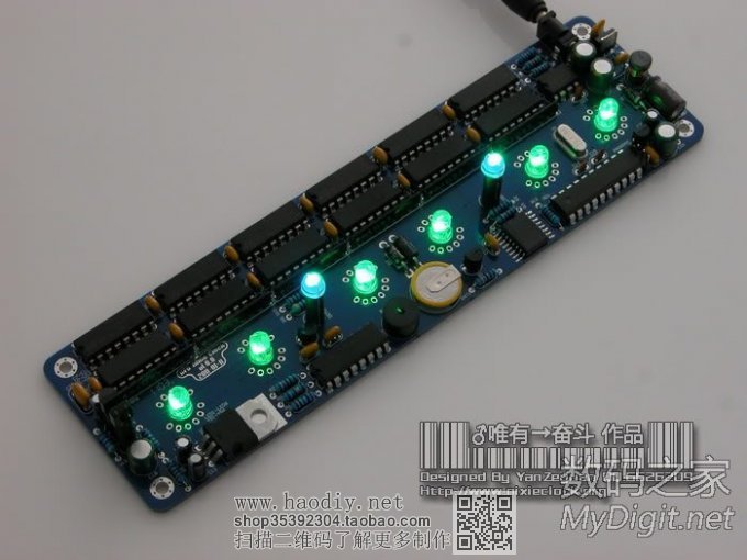 前几次设计的时钟有不少朋友多提出了很多好的建议,在这次软件设计的时候下了很大的功夫来尽可能的利用6颗荧光数码电子管和两颗冒号LED以及6颗RGB LED来组合出更多的功能。配合电子钟专用的红外线遥控器,设计出了很全很人性化的操作功能: 1、单键操作。以前设计的时候为了防止误按,有些操作需要长按遥控器,很多朋友觉得这一点会让人觉得麻烦,所以本次所有遥控操作即按即得,操作方便。即便是误按了SET,只要不按OK确认,再按一次SET或者按CANCEL键,都可以返回正常状态。 2、具有很方便操作的时间调整、日期调整和闹铃调整功能。在调整不同的功能的时候,背景灯会渐变显示为相对应的颜色,比如调整闹铃的时候,无论七彩背景灯是什么颜色,都会慢慢过渡为蓝色。而且保存的两组闹铃可以很方便的关闭任何一组,再次打开时,不用重新调整闹铃时间等等... 3、具备摄氏温度和华氏温度的转换功能。由于有些朋友需要华氏温标,所以这次设计了两种温度单位并自动换算。在查看温度时,按FUNC键就可以在℃和℉之间转换,并且自动保存设置,下次查看或者断电后,不需要再进行设置,会自动记忆你常用的查看单位。 4、具备中西方两种日期格式。上次在做辉光钟的时候,有朋友就说能否做成MM-DD-YY的日期格式,本次完全解决了这个问题,在查看日期的时候,按一下FUNC键就可以在YY-MM-DD和MM-DD-YY日期格式之间转换,并且自动保存设置,断电不影响设置的保存,下次查看依然记忆你常用的查看格式。 5、具备中国农历日期显示。农历是我们中国最常用的历法,当然时钟少不了农历。在这里,按一下DATE键能够查看公历,再按一次就会自动计算出农历日期,这个农历日期是自动计算出来的,我们只要调整好公历日期,就会自动换算出来农历,无需单独设置。为了区别开公历和农历的显示,在显示公历的时候,时间冒号的两点会慢慢隐去,在切换为农历的时候冒号两点会慢慢的渐亮,以示区别。 6、具备两组闹铃功能。这次的荧光电子数码管时钟贴心设计了两组闹铃,每组闹铃都可以单独的设置并单独的打开与关闭。当闹铃时间到了以后,会发出滴滴滴滴连续4声的提示音,持续1分钟,如果我们想关闭闹铃,只需随便按一下遥控器的任意一个按键即可关闭闹铃响声。 还有很多细微的人性化设计,在这里就不一一介绍,呵呵,总体来讲,这次DIY设计的功能比较完备,不过也欢迎大家多提宝贵建议。 SHOW一下一些功能界面: