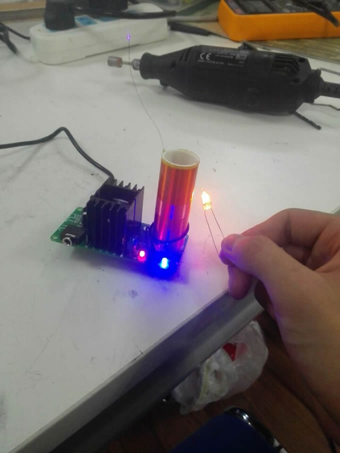 无线输电原理:用一个线圈两端其两端接LED,靠近发射装置,LED将会启亮,原理是谐振式无线输电。