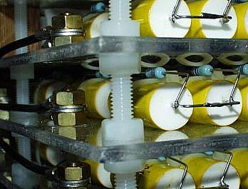 留意!电容之间没相关密打仗!要留有必然旷地,层与层之间要用4mm厚的有机玻璃断绝,每层包括两个链,牢靠行使塑料螺丝(一样平常都叫尼龙螺丝), 每层都有各自的接口使之成为独立可行使的单位,如图: