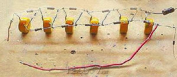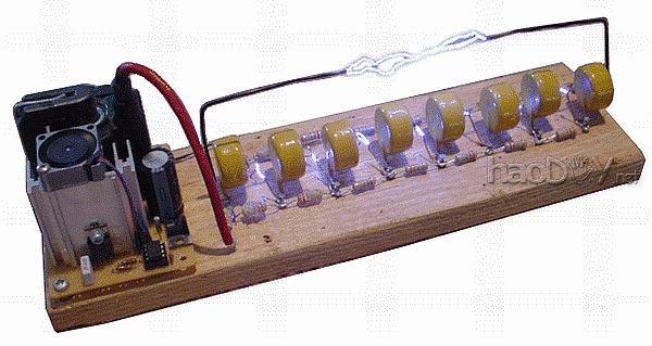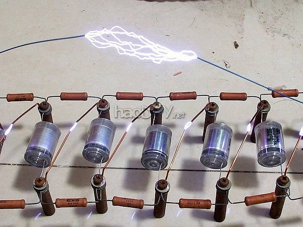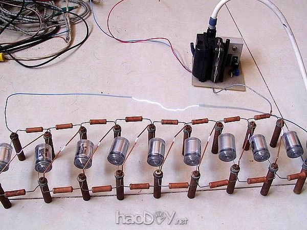 这款马克思产生器总共有六级,每一级由0.002uF 20kV的电容和两个1m欧姆的电阻组成。左边是一个霓虹灯变压器(9kV 30mA),它发生的高压交换电,通过10个1N4007串联构成的整流器整为直流电,给并联的六组电容充电,当电容充到必然电压的时,就会击穿电容间的放电尖隙,这时6组电容就酿成了串联的情势,电压骤增,开始放电,发出很大的声响并能发生5厘米阁下的电弧,约莫每2~3秒放电一次。把电容间的放电尖隙改革成球隙,电弧长度还可以大幅度进步,到达15厘米阁下。够简朴吧!简朴组装: