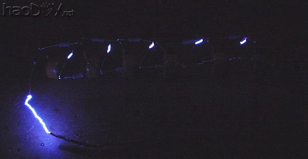 换成廉价的高压产生器往后,整个别积就袖珍下来了,可以所有装配在一块小木板上。必要留意的是高压晶体管轻易发烧,必要配块大点的散热片,最好还装个小小的散热电扇。这款高压产生器可以拉出10厘米长的电弧,够你乐一阵子了!
