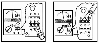 5.测三极管(T),要领见图2-6-8。万用表置NPN档,测T1、T2(3DG6),留意万用表的插孔选在下面一排,三极管的e、b、c应对号入座。(hFE)值大于80。T3为PNP型,以是量程改为PNP,把三极管插入PNP档的三个插孔,同样要留意e、b、c三根引线需对号入座,不能插错。(hFE)值大于60。