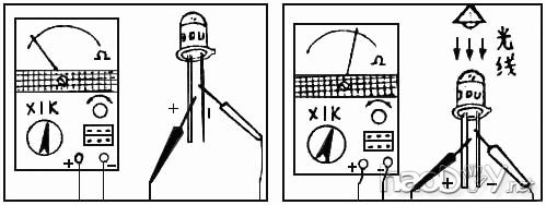 6.测光敏三极管(3DV),要领见图2-6-9,万用表置Ω档×1K处,黑表棒接3DV的正极,红表棒接3DV的负极。先用手指封住光敏二极管的窗口(玻璃泡),阻值极大,将窗口对着光泽较强处,阻值敏捷变小,约几KΩ。