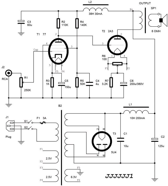 | 西电古董扼流圈显得太旧了,不过要是重新喷漆就更不伦不类 看看下面 秀一下内部 露点特写 上电路图。B+为400V-430V,使用300B的电源牛刚好 77 或 VT-77 可能是目前为止最接近WE310的古董胆。 1、管脚管帽完全相同;除77 跨导略小外,参数接近;外围电路兼容; 2、不同点为77灯丝为6.3V,而310是10V。 (责任编辑:admin) |