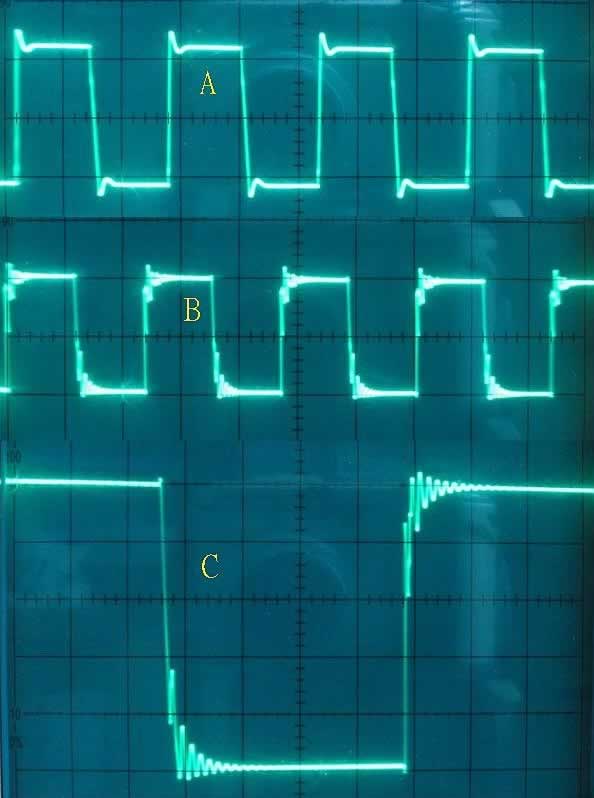(三) 減低高頻抑制的幅度:若將並聯著輸出入P1和P2的落地電容除掉,機的頻寬可由10Hz至70kHz的驚人響應闊度 圖(8)的B波。C波是B波的經示波器的放大圖樣 (豐富的空氣感和餘韻) ,當然人耳是聽不到70kHz的超高頻,但亦可憑聽音樂時人耳對多次倍頻,諧波中感覺到音樂的空氣感和從容度;不過為安全超見,不宜完全拆除這抑制電路,筆者建議降低其抑制幅度,電容0.003仍保留,而將原有的1k電阻改為3.9k,看圖(8)的A,方波的凌震仍存在,但已降低了一半的幅度,是適可而止又能達到理想的收效,滿意了!還有的是這兩聲道的0.003u亦是不同的牌子電容,既是如此!筆者就動手將這兩聲道的0.003u全接上CDE的Black Cat電容,若在交連聲頻使用時Black Cat是濛聲於Black Beauty;相反!用在抑制電路時,採用反應效慢和較濛的電容,反而聲音表現得更通透和生氣勃勃。