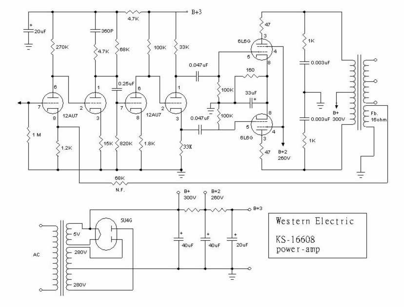 亦有某些麥景圖MC-240的用者,不明所以的將6L6G/6L6GA插在MC-240上,雖短時間未必發生危險;但危險仍存在,不可忽視。 應知6L6G是承受不了MC-240的高屏壓和大電流的工作狀態,很容易引致6L6過苛而縮短壽命;更甚的可能燒毀輸出牛。通常以同條件:牌子、製造廠和製造年期時,細功率的膽在音色和細緻方面是勝過大功率,即是6L6家族中的最細功率型號是6L6G/6L6GA是最好聲的,而且較易找到老年期的極品膽,包括英國或美國的葫蘆形石墨膽;雖然6L6G/6L6GA的最大功率在推挽的工作是於18W,又因KS-16608的額定功率祇有12W、最高屏壓300V、簾?極是260V,故此使用最高質素的英國大葫蘆6L6G是最合適,不妨一試!現奉上的線路圖是由筆者按零件的銲接連線所繪劃出,請恕簡略了一電源的部份線路。這每聲道的KS-16608是用兩支12AU7,兩支6L6和一支5U4G。