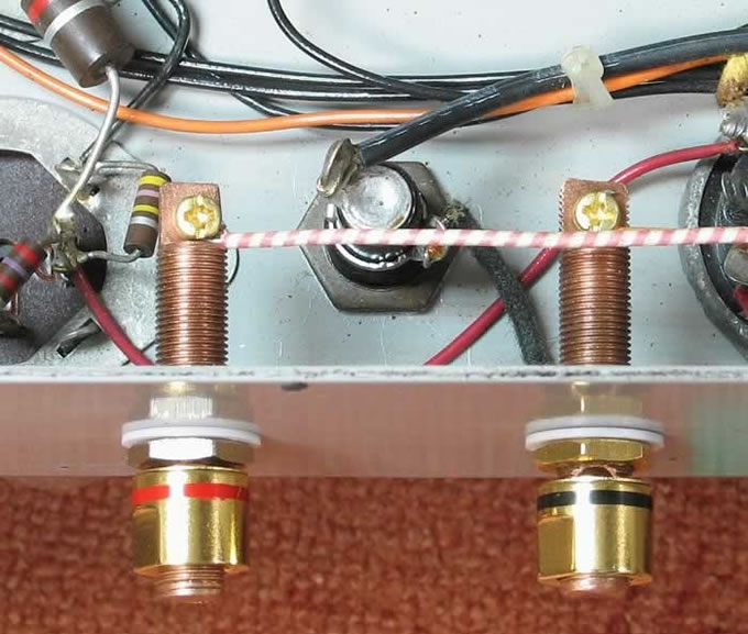 (二) 喇叭接線位:這KS-16608雖不算太老,是約70s至80s之間面世,也算為古董機,它的喇叭接線位仍是古老式的螺絲接線排,若你想接上現今的Hi-End線ZU Cable或Audioquest的大叉,就是極度的困難;若接上幼小的西電綿布線就容易得多了。可惜的是,機主潘兄在買機時已被改了新裝的金接線柱,看圖(6),更糟的是在機身鑽了孔;就大大破壞了原裝機殼的「原味」感覺,另外錯的是前改機的大師竟然沒考慮,鑽上這兩小孔(太細)是有可能會令這金接線柱在機殼短路,或許!他安裝時是未短路short的,而落在潘兄手中就short了,於是短路的那一台是不尋常的細聲,是在short與未short之間形成低ohm的電阻;幸好還未燒毀輸出牛,是可慶幸!經了這孝驗,也表現得出這西電機的能耐寬容度是強的!眼見這不妥善的情況,當然第一時間要解決!既然已鑽了孔,不妨將錯就錯的將這兩小孔由4mm再鑽大至10mm,可以裝得上真正靚聲的OFC紅銅接線柱,而又能輕易接駁新一代的大蛇喇叭線,看圖(7),由原有的喇叭螺絲接線排處引線到這粗壯的接線柱,這摩機師是用含銀的telfon線,是新一代的科技產物,顯然是新舊兩派的不相配;圖(7a) 兩派的比較。若換上老西電綿布線,就襯到絕了!而且聲音亦合拍。