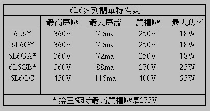 筆者手上一對單聲道KS-16608是來自星加坡的發燒友。話雖說是一對;但又並非全完是配對,很多時這類單聲道後級因製造年期之產別,和祗要求單聲道的服役用途;是不易找到真正的「天生一對」。這兩部KS-16608就是其中的例子,一部是Dukane;另一部是 Multiplex West,明顯就是兩間不同的廠,機內零件當然有分別,易發現的是交連電容不同,還有機頂的用膽型號也有不同,一是用6L6GB,另一是用6L6GC,看這兩機內的電阻偏流值,輸出牛阻抗和電源高壓是接近相同,為何要分6L6GB或6L6GC呢?相信是 “隨意”而不是 “刻意”。很又因這KS-16608最大輸出是12W,即使用6L6GB或6L6G都已足夠,多讀者曾來信問6L6家族如何分辨6L6,6L6GA,6L6GB,6LGC,筆者順帶列出這6L6系列的不同功率特性,以便大家明辨和使用合適,玩得好聲時亦可確保你的愛機安全,請看下表 圖(3)