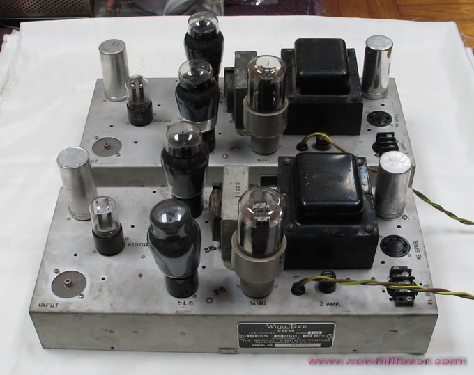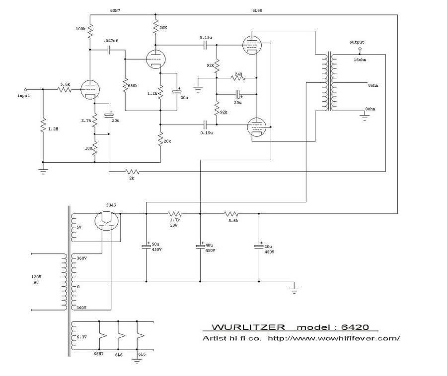 Wurlitzer 暫時仍未被列入 hi fi 發燒的機種,當時祇是為電風琴音頻放大之用而製造,至於維修保養不是大眾市民關心的問題,線路圖更不易落在民間;筆者祇好看著機在零件和引線自行繪畫線路圖 圖 (3) 。 model : 6420 的線路是很簡單,一只雙三極 6SN7 分作輸入增益放大和 “ 屏陰倒相 ” 之用,一對 6L 6 約有 18W 推挽輸出功率。在設計線路時,通常需要提供正偏壓於這屏陰倒相級的柵極,一種方式是從第一級放大的屏極直接交連至倒相級的柵極,可免去交連電容。另一方式就是本線路圖所示的,使用交連電容分隔兩級膽的直流;至於倒相級的偏壓就交由 680K 電阻從陰極引回少量正電壓到柵極,這稱為自給偏壓。後者的優點是可避免因第一級膽的屏極電壓若處於不穩定而影響分相級的偏壓;即使這 6SN7 在進入衰老時,其工作狀態都不至於太糟,這是很傳統又能保持較長時間穩定的線路,易於給初學者試製。