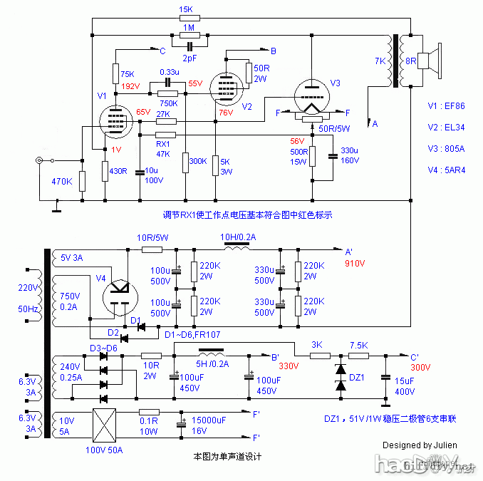 ![]() ![]() ![]() 用了J版的805電路圖做了一台合并機效果良好. 最長開機時間3小時機身湯手,但工作正常無問題 首先多謝各住燒友關心做這部機器之前已知無法把零件整齊安放機箱內空間有限,發熱的零件是805燈絲橋式整流子 3502 两隻 和两隻500 ohm/40w,電源牛.唯一不能達標的是J版所說EL84陰極和805柵極的電位差耍有20v左右我的衹有17v-18v.更改RX1數值也不能達標 這機器的輸出牛是多年前在左氏音响買的正方波測試在10khz 還可以再上不用說了,在調試階段中想過耍放棄它因左右声道噪音接近100mv.後來看過綱上的燒友做胆機的心得知到輸出牛耍加牛蓋機內耍少用引線,而每一引線耍有屏敝.805燈絲的濾波電容用20000u/16v才可以把噪音小於6mv.左声道2.28mv/右声道5.54mv 曾經年少兄 你說的沒錯 我有同感如果在高壓部份有良好的絕緣度805不太難做它出來的音埸和声音不差於300B.它的推動力和爽的感覺300B是沒有的。 (责任编辑:admin) |