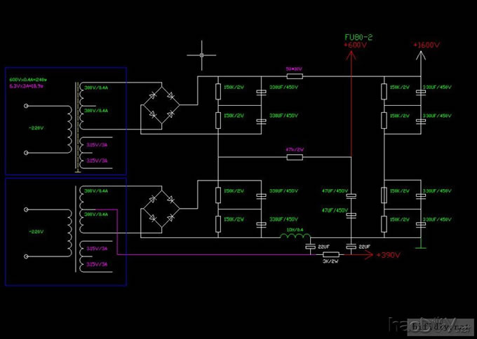 首先祝大家新年快乐!万事如意! 献上年初制作的FU80单端 FU80-胆机中的战斗机 经过几个月的努力,先后试验了N种电路,我的FU80终于完成了,由于FU80工作电压高,灯丝电流大11A,发热量大,所以这次比较谨慎,全部过程是用示波器和假负载进行调试的。为便于调试,我是做了一段1000HZ的音频用电脑播放进行调试。 电路输入级开始用的是6N8P SRPP+6P3P推动,经试验推动不足,实测FU80功率输出只有8~10瓦,如果用CD机播放功率可能大些。后改用6N9P+6P3P推动,功率略有提高,还是不满意,之后又在另一个声道改用6J4P+6P3P推动,这次增益足够,接上喇叭试听,音量电位器只能转动1毫米,要么是无声,要么是震耳欲聋,调整了6J4P的廉栅极电压到100伏,接上10K负反馈后,增益降低,用电脑播放一段发烧碟,效果不错,原来6J4P的声音也是这么甜美,点上一只烟,靠在椅子上,凝视着音箱开始慢慢的品位,这时看到音箱前面的一块瓷砖在震动,心想可能是瓷砖松了吧,没有在意,过了一会儿音箱也开始震动,又一想可能是音箱没放平吧,只顾欣赏音乐,仍是没有在意,片刻之后,桌子开始震动,桌上立着的机箱也开始大幅度震动,观看示波器调到最大分辨率波形也未见异常,声音也正常,心想这可能就是寄生震荡吧,如果不是次声波就是超声波,因为是低频,次声波的可能性大些,马上关机,待管子冷却后再次开机,现象依旧,负反馈加大到20K后现象消除,考虑到负反馈太大会影响音质,负反馈还是恢复到10K,重新调整了6J4P的廉栅极电压,发现廉栅极电压调到60伏时比较稳定,调到100伏时就容易产生寄生震荡。由于买到了第2天的车票,匆忙改完另一声道后回家过春节。 春节过后,仔细分析觉得如果不用变压器偶合,推动级无须用6P3P,于是又改为6N8P SRPP+6N8P/2+6N8P/2两级放大推动,增益足够,功率可以做到90W,效果也是很好,后又改为6N8P/2阴极输出,听感也是不错。只是觉得级数太多了,担心大环路负反馈会引起相位偏移。后又减少一级放大改为6N9P SRPP+6N8P推动,功率略小可以做到50W,最后确定为6N9P SRPP+6J4P+FU80。 在整个试验过程中,6J8P也用过,从曲线来看6J8P的线性比6J4P要好,在输入信号幅度不是太大时试验了6J8P的零栅压状态,此时输出可以达到不失真功率26W,如果加大信号幅度,通过示波器可以看到,波峰被拉尖了(由于栅流),而波谷被拉宽了(超出6J8P的线性范围)。因为我手中的6J8P都是M级的,所以没用。 至于6N8P和6N9P,6N9P的高音明显要比6N8P清澈透明,而6N8P在听感上要比6N9P温暖厚实,烧友可以根据自己的喜好选择。如果要做FU80胆机,个人觉得以下几种电路较好: 输入6N8P SRPP+6J4P推动或6N9P SRPP+6J8P推动; FU80的调试很简单,接上10欧50W假负载,廉栅极电压调至500-600V,用两块万用表一个接在阴极电阻上观察电流,另一个接在假负载测试输出电压,同时用示波器观看输出波形。调整FU80栅极电压在-60至-90V时,FU80相应的阳流在150~250MA,阳流在150MA时不失真功率大概在40W,阳流在250MA时不失真功率大概在90W,烧友可以依据自己的听音环境和电源牛功率选择。 其实FU80胆机最大的难度是电源部分,高压带来绝缘问题,电源变压器绝缘和输出变压器绝缘;大电流带来的温度问题,大功率带来体积和重量问题,当然还有美观和造价问题。 我这台FU80胆机,FU80的工作电压取到1600伏,高压空载1800多伏,采用两个高压牛和一个灯丝牛,由于100W输出牛太大,改用两只60W输出牛串联。一共用了10个牛。电源牛总功率1320W,每个电源牛罩中装三个电源牛,并采用12V电扇强制风冷。 高压牛罩是采用长筒灯和象鼻灯改制的,去掉象鼻灯上的射灯,装上一个小电扇可以给牛散热,后来将电扇装入了牛罩,就在上面装了一个LED作为高压指示灯。 FU80的灯丝开始采用的是直流供电,四个10000微法的电容滤波,50A的整流桥,开机后整流桥太热,加装了两块散热片还是太热,另外交流声很大,加平衡电阻后还是交流声大,测量后发现整流桥的两臂电压本身就不平衡,相差很大,一边是7.2V,另一边是4.4V,耐压越高,相差也越大。于是尝试交流供电,只要跨接灯丝两边的平衡电阻阻值相同,交流声还是很小的,大概在3~5mV之间。 要减少交流声,首先要做好接地,做到一点接地,之后用示波器延电路逐级查找,找到后对症下药进行处理,修改布线或更换电容。最后再用示波器检查,信号关到最小后,显示是一条直线。开机试听,除了开机时音箱“嗡”的一声后,再没有交流声,耳朵在音箱布上,才可以听到“沙沙”的电子噪音和轻微的“嗡”声。 在装机过程中被高压电击了5次,其中一次是FU80管帽的1600V的高压,手指打了一个白点,半个胳膊都是麻的,半个月后,手指上的斑点象个肉刺似的脱落,其余几次电击都是调试中被电容打的,切记在调试中电容一定要及时放电。 全部完工后,接上音箱进行试听,低音富有弹性,厚实而有力,人声甜美,高音纤细,细节丰富,交响乐气势宏大,声场定位准确,爆棚易如反掌。 相机的SD卡坏了,内部的图片也没了,其余的图以后再补吧。 (在2008年最后时刻决定参赛) 胆大妄为2008.12.31 正面照