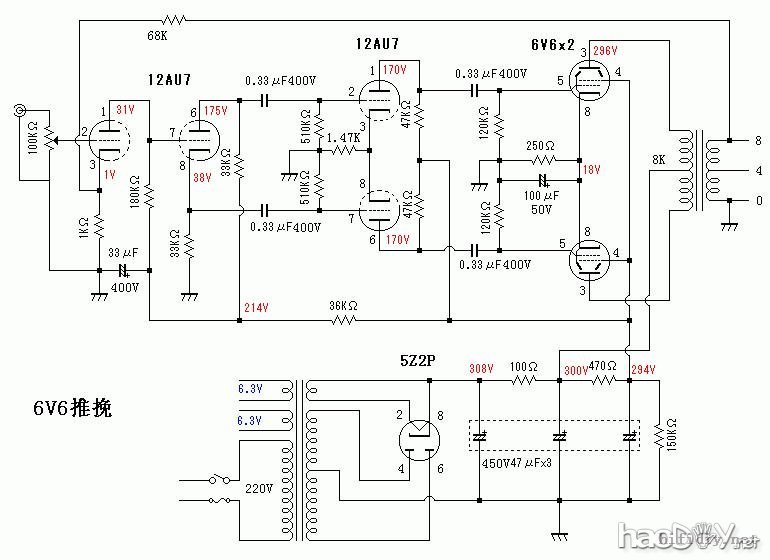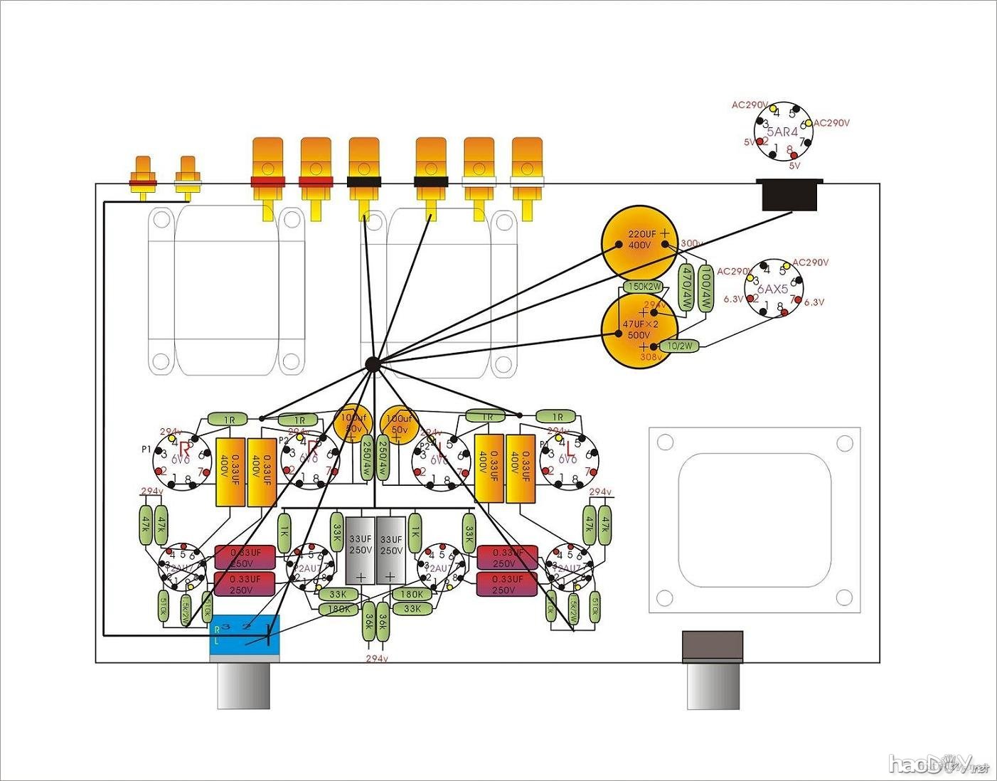 本次做机特点不用搭棚条(板),不用多余跨线,元件直接焊在管脚上,不用二手材料,采用分段一点接地。 1.选好图。 2.选好料。 3.布好局。 4.用心做。 6V6PP搭棚图