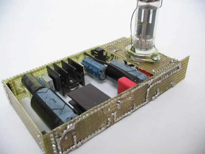 以下就是和田茂氏胆前级的定型外观,由于涉及到高发热的电子管和采纳了胆机发烧友贯用的电子管机器的外观形势:电子管外露、。使得它看起来很像一台小型的胆后级。 正面图: ![]() 采用的电子管: 内部部分线路图 |