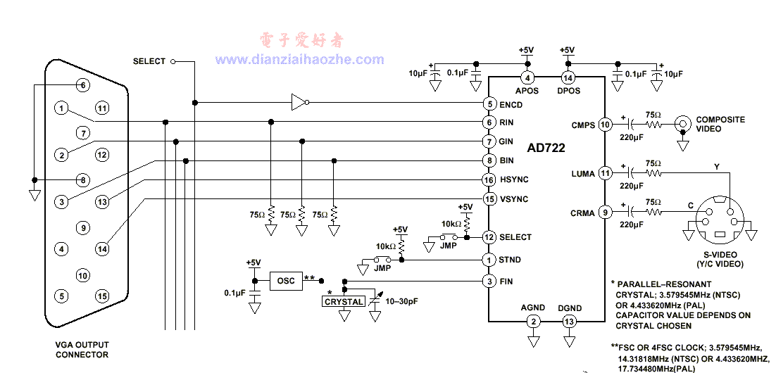 VGAתTV½Ó¿Úµç·ͼ£¬²ÉÓÃÁËÒ»¿éAD722ÊÓÆµ±àÂëÆ÷оƬ¡£