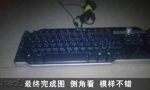 5、完成布线,将键盘键帽安装复原。在最后的蓝光和红光的接头用二合一接头合并,接上USB驱动线,以USB供电。