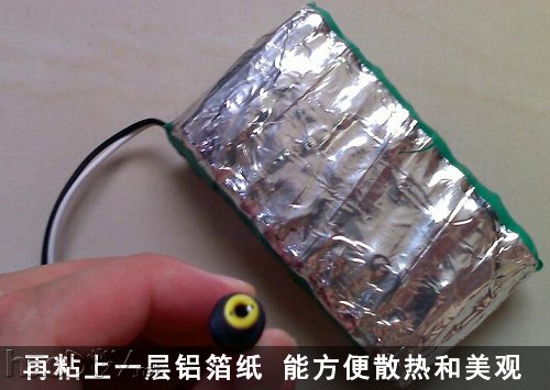 2、用普通的电烙铁和焊锡,剪几根导线,将电池正负极相连,最好使用薄铝片,因为容易焊接,如果没有普通导线也可以。焊接的时候注意,焊锡膏要稍微多一点,如果技术差的可以使用强力焊接剂。电池正极不好焊接,所以要多焊几次。焊好后要动一动焊点,以防止虚焊短路,最后把电源接口焊上,焊接好后用无水酒精清洁,去掉多余的焊锡。为了安全,绝缘胶布是不可少的。但是也别太厚,不然影响散热。最后在上面包裹上铝制锡箔纸,帮助散热,看上去也像那么回事儿。