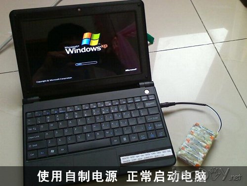 注意: 锂电池、铁锂电池 以及 镍镉电池 绝不可像本文这样DIY,使用时必须加接保护电路,否则后果自负! 3、使用前测试下,电压稳定在20V。 4、取下笔记本电池,插头接入电脑。开机,正常载入系统。 经过几天的测试