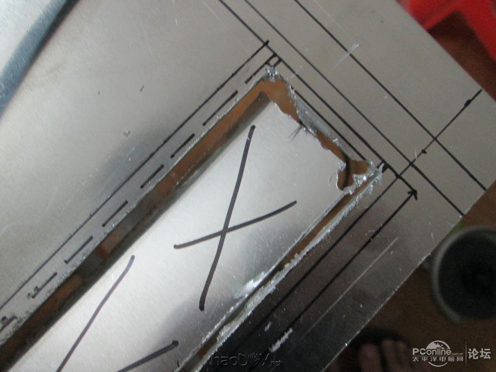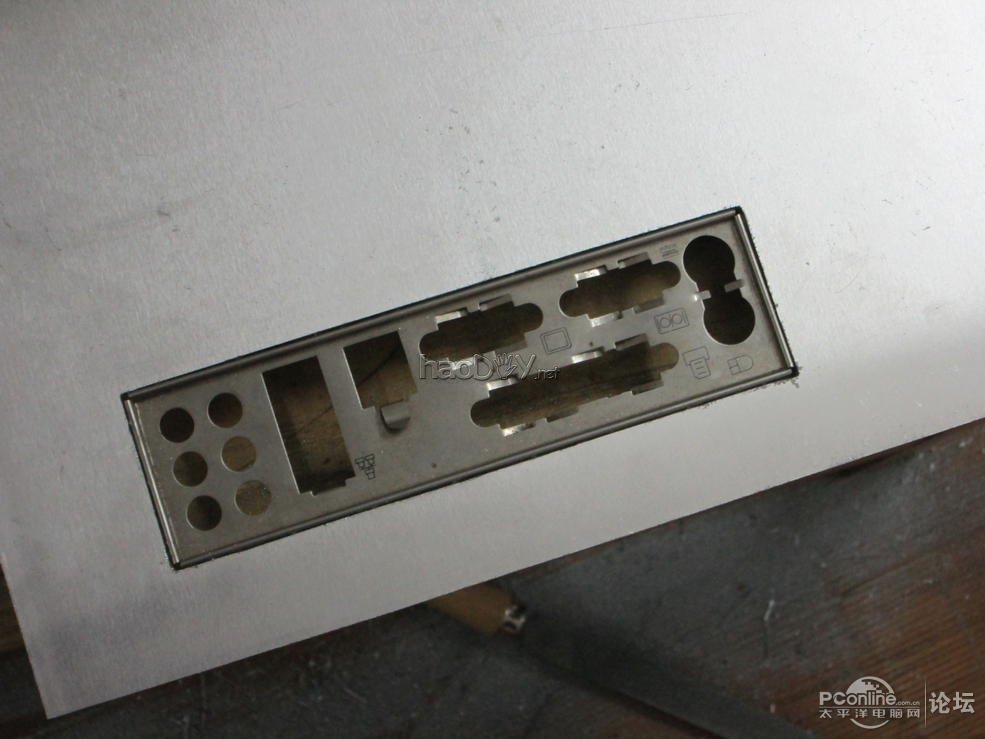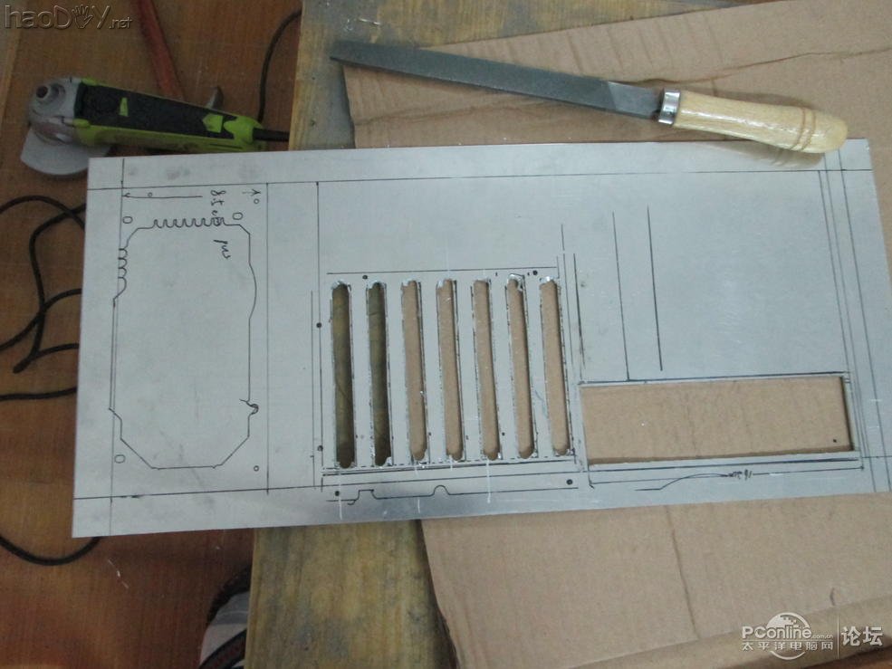 由于挡板孔位宽度太窄,只有4cm左右,125mm角磨机很无力,现在知道如果有手磨机就好办了。没办法用电钻上,磨磨唧唧慢慢来吧    。 此处不能无视脚丫,,弄这东西可出力不少,很好的夹具,还是全自动的(窃喜)。还被角磨机磨下来的铝屑烫到好多次,还好依然给力。  用钢锉锉几下打个直角装上挡板,貌似还不错哈  !  来个近照  装个2奶备用主板  来来来 看看效果  看着还行,行不行 ,咱接着来,弄PCI的孔位 ,那么多... 太坑了,由于切的时候温度过高,铝板强度不够,窄的地方都变形了    。  变形肯定不好使,用锤子给我锤回来,用打磨了几下    。  来个近图 ,顺眼多啦吧。  我就是不怕烦,真的不怕  。装上显卡咱看看效果。(显卡HD3650在朋友那里劫来的,用了2年,虽然沦为亮机卡,依然很坚挺)。  接下来搞电源卡位 ,还是下置的,亲,你看出来了吗!     角磨机给我上,我也得跟上。要不也没有司机啊。     给电源装上,看看效果。我就不怕烦,就不怕    。  这个是我用的最彻底的磨片了,干碎了好几片,还好没伤到我。#p#分页标题#e#  各个面板都做好了(自己偷偷的做了几片 ,忘记拍照了  ),先把箱子支起来? 好吧,先安装铝角。  钻孔,我的最爱。   近照  攻丝  安装(连接侧面板和上面板)  我再装  然后就这样了    拍完照,眼前一黑,当时就给晃蒙了。  此处有败笔,精度不够,有偏差。东北话“缺肉了”想当年大学磨锤子磨得还不错,现在掉链子,汗颜  !|  看看如此丑陋的前面板     侧面看看箱体内部,什么都没有,还是什么都没有!   给后菊花面板加个抽风的风扇位,后来我真的就抽了  。   先用小钻头打小坑,然后用大钻头钻孔,那么多孔啊(好几十个,没查)白钻了,结果差强人意,差强人意啊。。。后来干脆干掉!