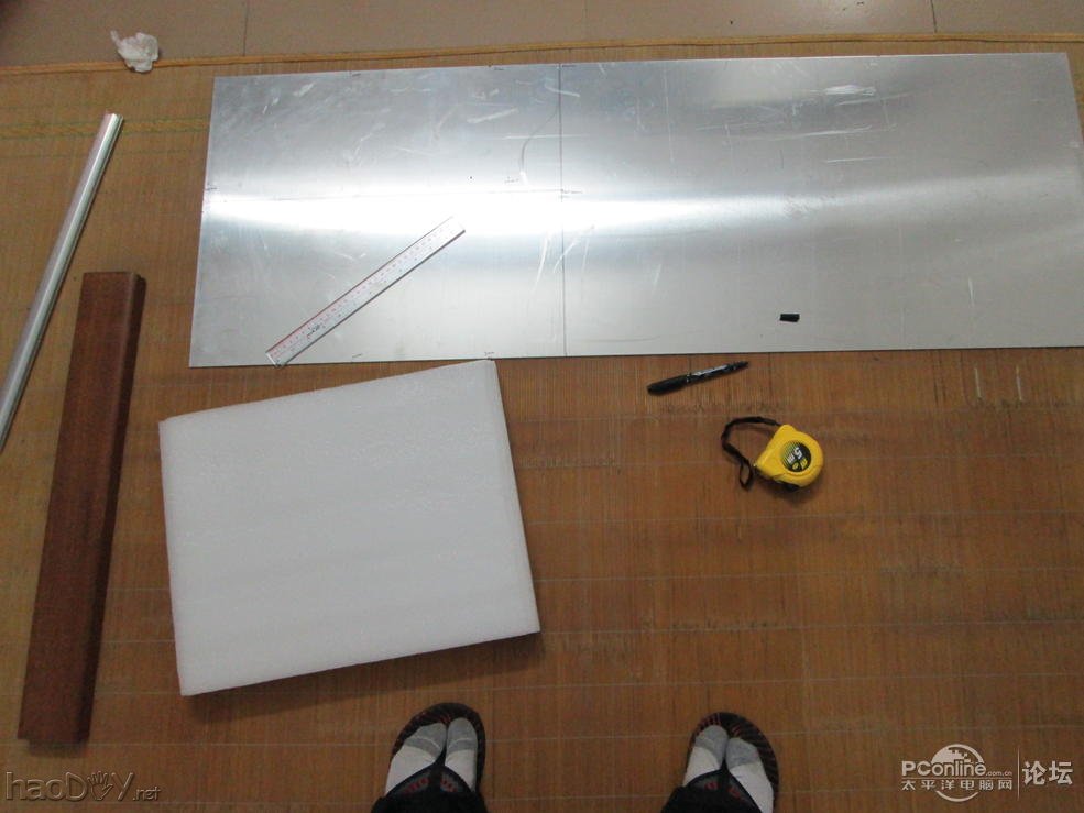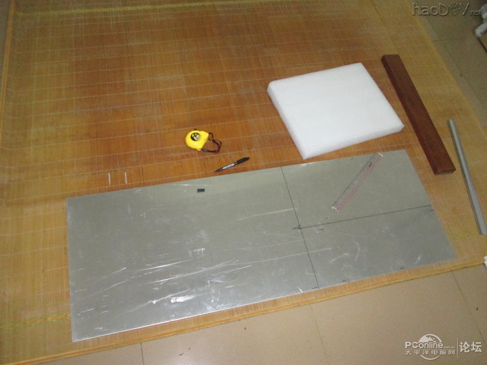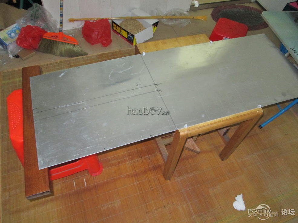 缺爱的小茶几 ,就要让我搞得千疮百孔。苦逼没有卡具,用线卡子做固定,有才吧!好吧开整。图里面分出的两个长方块是机箱的顶部底部    。