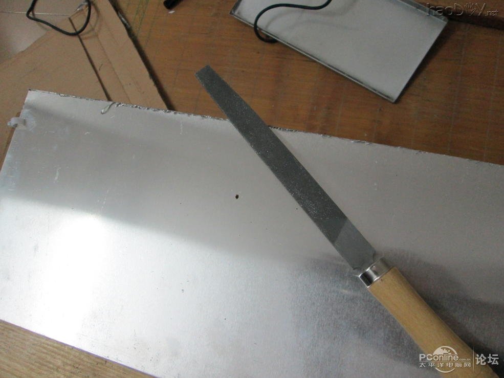 这一刀下去,差点没干残废了,切得歪歪扭扭的  。  准备下  切出机箱顶部铝板  好多毛,那钢锉干掉他们    。  光溜溜的 ,很滑的。不信你摸摸~~~    (请无视我的脚丫子,穿袜子穿人字拖,你干过吗?)  装上铝脚试试看,效果不错,不信你看  !  制作过程... Ctrl+C,Ctrl+V ...ok了   这个准备做机箱的尾部面板,菊花准备    ,开爆...      菊花惨不忍睹。