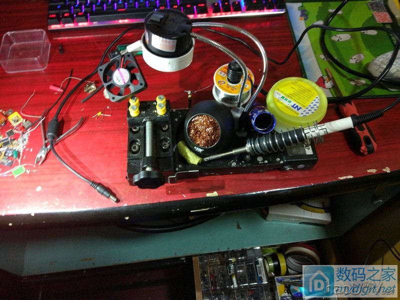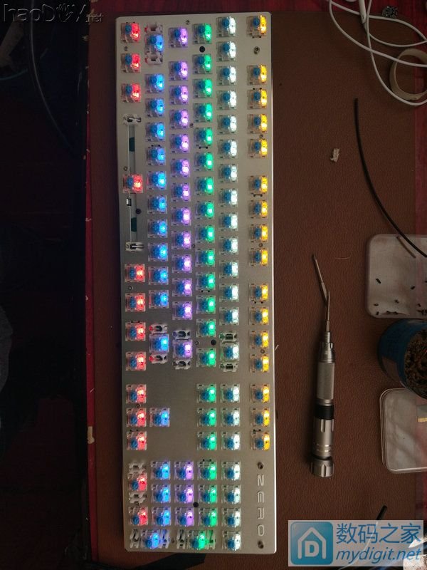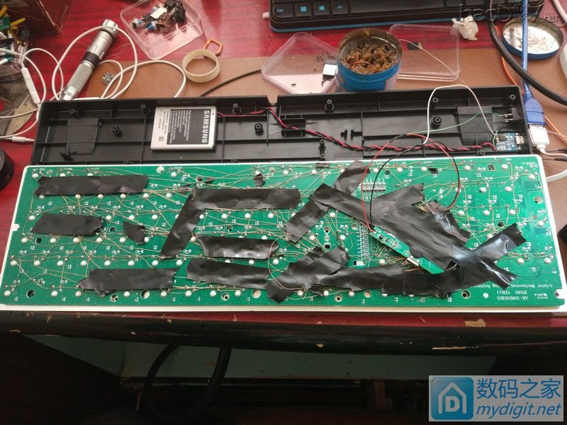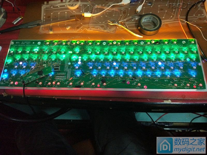 [ 此帖被x_iaoze在2017-01-03 16:53重新编辑 ](责任编辑:admin) 上面说到要开始飞线了。。。 不多说了,飞线吧。。。。。    此时凌晨5点半了。。。。。 楼主人在北方,住平房,没暖气,室外气温-3°。。。。。 然后此时的楼主,腿是麻的,眼睛是花的,手是斗的,人快废了。。。。 关灯,上床,唯一值得高兴的是电热毯是热的。。。 开机,上qq,没留言,没短信,没电话,我伤了伤了心,我放了放了手,我们的爱已无法挽留。。。。。。。。 睡两个小时意思意思吧。。。 好吧,就两个小时。。。 我对灯发誓,我就睡俩小时,我定5个闹钟!!!! 一觉醒来,太阳那么大?几点了?手机呢?(省略n字)卧槽怎么在垃圾桶里。。。。 找到手机后发现,已经快12点了。。。。 不重要,这都不重要,继续飞线,对,键盘最重要,现在精力充沛,适合飞线。。。。 讲真白天飞线比晚上飞线舒服多了。。。。 省略一百万字,省略一百万次草泥马。。。。  艹艹艹,神图镇楼有木有,盘丝洞有木有,外观吓人有木有!!!! 加固下,上电测试,我的内心是异常激动的。。。。  下载键盘测试软件,就这货,按一下就变黄了。。。没按就是灰的。。。。。  一开始测试,伤心总是难免的。。。这么多线一点问题没有是不可能的。。。。  反斜杠变成回车了,回车也是回车。。。 小键盘8和斜杠键一直按下去了。。。 p键没反应。。。 我的内心比较崩溃,这怎么搞。。 先从反斜杠下手,发现原来薄膜键盘的回车键和反斜杠按键和机械键盘的布局不一样。。。 知道原因下手当然没问题。。。。 然后剩下的电路检查了好长时间,没有丝毫问题。。。。mdzz这怎么办 检查漆包线粘连的问题。。。 果然有粘连现象,三根连在一起,焊接的时候不小心把另外两根线的绝缘漆弄掉了,镊子稍稍用力,ok。。。。。。  看着都是赏心悦目。。。。。 此时已经晚上8点多了。。。。。 开始研究led 键盘插上usb上。led亮,插到充电器上,led不亮 猜测,应该是主控ic 控制开关三级管导通截止 然后我发现烧掉一个三极管led就亮一排,还会冒出一股香喷喷的烧毁味道。。。。 #p#分页标题#e#然后我就桑心病狂的干掉了21个三极管。。。。 玩够了。。。热风枪取下,短接,现在想想,mdzz我是不是脑子坏了,直接拆下留着以后用多棒。。。。 烧三极管时随手拍的一张。。。。  104按键解决完了。104颗LED解决完了。 剩下供电问题。。。。104颗led费电亮恐怖(mdzz我忘记测测电流多少了)。。。 想到电池,18650想想都有罪,14500也不可能,本着能省就省的原则,想起了角落的pos电池。。。。  大约2500ma多一点吧。。。 朋友说pos电池很不靠谱,还有漏电什么的。。。 算了。还是用手机电池吧。。。。 手机电池储备量也不少。。。  挑选一个相对靠谱的,三星电池,14年淘宝买的,猜测应该是国产的,应该不会爆炸。。。。  然后就是开孔,首先充电口,开关口。。。手术刀开孔,效果不敢恭维。。。。要不是受伤养病,我一定拿到cnc开孔。。。  装机前的最后一张留念。。。。  装机前的最后一次测试,虽然我已经拧紧螺丝。。。。  图多未完,请继续移步楼下。。。 键盘测试,全部键盘ok,全部led都亮。。。。,此时我的内心激动坏了。。。。 键帽已经装完。。。。  这张图是晚上已经把桌子收拾好了,实际在使用时的样子了。。。。  朋友点评,有点光污染,其实我觉得还可以,各种满意。。。。。。 此次改造的遗憾,原usb孔忘记堵死了。。。 14年1500ma的电池续航时间有点短,也就不到10个小时的样子 估计是电池有损耗,国产电池容量虚标之类的问题了。。。。 以后有时间买个1w毫安的电池。。。。  最后还剩下一张图,留给此次改造键盘的功臣。。。。  T12烙铁,手工DIY焊台。。。。 说什么国产头子寿命短各种渣,其实我感觉不然,这个到刀头的发热芯,国产全新的。从年初买的,到现在因为t12有恒温功能,经常连烧几个小时,这次改造键盘,两天连烧8小时,还是上锡闪亮亮,,,, 总结下这次键盘的改造之路应该改进的(供后人效仿)。。。。 第一,切完pcb后一定不能急着把轴装上去,应该在正面飞线,用热熔胶枪打固定,全部飞线完了用镊子一个一个测试,电路测试好了才能装轴 这样做的目的,方便以后换轴,供电方面电路维护,拆颗简洁,没有盘丝洞 第二,漆包线不太好上锡,其实可以用烙铁上去用力刮一下,然后直接上锡,万用表测量下,应该都没问题 第三,至于别人帖子都会说要画电路图,其实我感觉多此一举,我直接照着薄膜键盘飞线,这就是一张可以信任的电路图,为什么要再画一次,还要承担画错了的风险呢? 然后好像没什么了。。。。 斗胆申精,请尽情砸米币。。。。。 差点忘了,爆一个BUG,高级编辑模式带有敏感词汇,会被吞楼。。。吞了4楼我才意识到。。。。 |