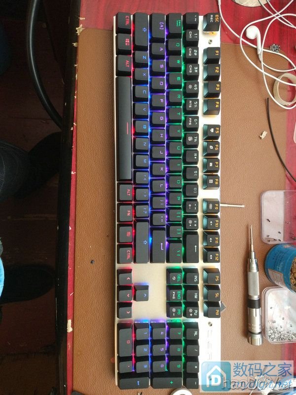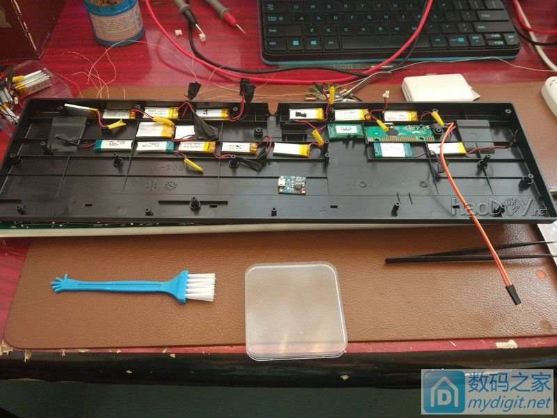 | 其实我曾经一直觉得玩机械键盘的人太浪费时间了,一定都是闲得蛋疼 偶然的一次usb延长线坏掉了,然后我就十分蛋疼,用无线鼠键接收器测试,然后修复usb延长线,结果延长线修好了,无线鼠键接收器坏掉了 然后在2016年7月1日一狠心一跺脚去淘宝买了一把机械键盘,也不知道买什么轴,就知道我不太喜欢玩游戏,卖家说游戏选黑轴,店里只剩下了青轴和黑轴 然后2016年7月5日,顺丰到货万分激动的打开包装,就是这货(这键盘当时没有拆机图,咸鱼卖的时候拍的)   然后大约是2016年12月初发现,机械键盘为什么不能是无线的呢? 当我意识到这个问题的时候我首先想到应该可以把usb线剪了,万能的淘宝应该有现成的无线模块,加装上去就好了 打开淘宝大失所望,淘宝找到了一家,美国产的无线hub,体积大不说,价格冻人,498,想想算了。。。 看看成品价格吧,87键的蓝牙无线最偏的价格也要200-300,关键我这人喜欢用小键盘,87键价格还那么贵,再看看104键的,md要命呀,样式不中意不说,价格更是吓人动不动就要上千,屌丝的我以前一直用50一套的无线鼠键,上千的价格对我来说是不可能的。。。。 百度看看吧,然后我就惊呆了,和我一样想法的人很多,手动改造无线,工程也把我惊呆了,等于重绘键盘电路图 然后无线的想法被搁置了几天。。。。。 终于在强烈的内心挣扎下,我还是决定改造一把屌丝价格的无线机械键盘 首先要做的就是处理掉上面那个已经用了快半年的机械键盘,因为我发现那个键盘并不是标准的长方形,强迫症患者不能忍受,去淘宝发现了一把119包邮的104键机械键盘,感觉样式比较喜欢,然后咸鱼定价119,邮费10元就把我人生中第一把机械键盘挂了上去,大约2天后的一个晚上一个人拍了下来,话不多说,立马把淘宝加入购物车已久的新机械键盘拍下,等待收获改造。。。 想改造无线,还需要一把无线键盘的无线模块,找了个按键布局差不多的无线鼠键,30包邮,拍下。。。 2016年12月25日,机械键盘签收,心中那叫一个激动呀     怎么说呢,东西感觉还可以吧,毕竟119的机械键盘,估计连入门级都算不上,做工还凑合,键帽装到轴上键帽可以带动轴轻微晃动,导致按键可能会不太规整,算了119不纠结细节了。。。。 看外观月看越中意,插上电脑没有10分钟拔下,放到角落吃灰,静静等待无线鼠键到来后开始改造。。。 2016年12月28日,30包邮的无线包邮鼠键签收,签收的时候我并没有选择验货,然后到家后拆快递时我还在想,包装这么单薄,键盘会不会受伤呢? 结果还真没让我“失望”果真死的很惨。。。     讲真,这薄膜键盘还不错,30包邮还带鼠标 然后找卖家,卖家处理态度更让我吃惊,本以为会给我重新发一个,结果卖家直接让我签收,然后退款给我,我那叫一个激动呀,我本身就像拆模块用,再退款给我,等于白给我模块用。。。。。 狼吞虎咽的晚饭过后就要开始改造机械键盘了。。。 其实百度看了一些别人改造的经历我也没细看,大致思路就是,切断机械键盘所有电路,然后按照无线键盘电路重新飞线 嗯,对你没听错,全部切断,全部飞线。。。。 你要知道这可是104个按键。。。。。 要开始改造了,我的内心还是非常激动的,先开始拆机械键盘   本来打算哪里有螺丝就拆那里的键帽,不打算把全部键帽都拿下,后来想想都特么全部飞线了,也不在意拆装一次键帽了(后面的改造之路正面拆掉全部键帽是必须的)     拿掉所有键帽,拆掉后壳,观察电路发现,原来机械键盘的电路,用水平和垂直接的矩形键盘,然后我就想,万一无线键盘电路也是这样是不是就不用大面积飞线了?此时我的内心是异常激动的   事实证明,我在做梦。。。薄膜键盘电路图和机械键盘差多了。。。。 薄膜键盘无线模块。。   然后正当我准备把机械键盘全部电路切断时,我发现原来机械键盘,正面也有电路,需要对pcb正反面操作,也就是说,要把104个轴也要全部拆装一次。。。 要了命了。。。在这个问题上我纠结了一个小时,结果我发现键帽都拆了,也不差拆104个轴了。。。       我的内心时崩溃的,大母手指按吸锡器都要按废了。。。。早知道要拆轴,我应该买一套好一点的轴装上了。。。 然后一顿狂切电路板。。。。 (忘记拍图。。。) pcb背面每个轴连接的地方都有一个1M的电阻,虽然不知道为什么,但是省得切电路板了。。。 (忘记拍图,后面的电路板可以看到。。。) 我用热风枪拆的。结果电路板没有预热,直接350°拆,加上板子太薄,然后pcb变形。。。反正放在桌子上不是平的,最高点和最低点相差10mm左右。。你有没看错10mm,变形就是这么大。。。。 (忘记拍图。。。) 然后,我竟然傻呼呼的直接把104轴装上去了。。。。 现在想想都后怕,万一led电路也要正面飞线怎么办,万一有没有切断的电路怎么办,现在想想这样做是非常错误的,错误至极,希望后人不要踩坑,后面标注为什么会“错误至极” 104轴全部装上,找到一个软驱的电机线圈,就准备开始飞线。。。此时大约午夜11点左右吧。。。   对照薄膜键盘准备开始飞线了。。。   图多请移步楼下。。。 我就不信还给我吞楼!!!!! 上次花了接近一个多小时码的二楼还得重新码,求安慰。。。