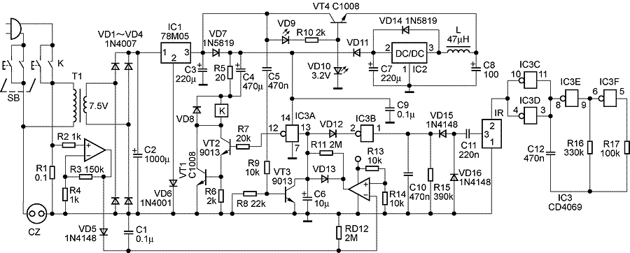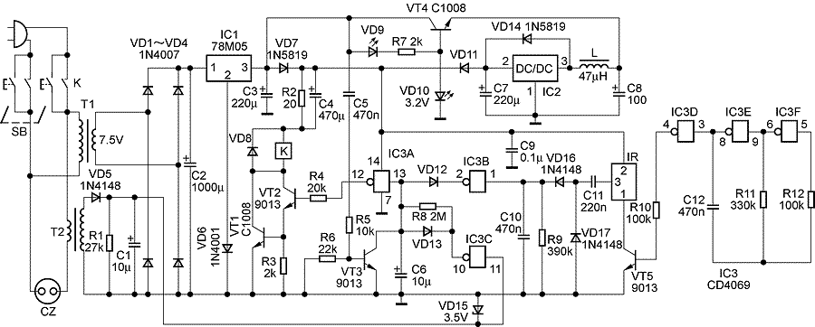 图1 制作好的电路实物 工作原理 这个零静耗彩电待机控制器的核心是采用了新型绿色储电元件——超级电容,再通过DC/DC变换技术,加上红外遥控接收头脉动式电源供电技术设计出来的。电路如图2所示。 超级电容又称法拉电容,特点是容量大、体积小、温度特性好、寿命长、功率密度大、可以大电流充放电,不会对环境造成污染。由于其容量很大,对外表现和电池相近,在一些场合可以代替可充电电池,因此也称作电容电池。其充放电过程始终是物理过程,没有化学反应,正因如此,超级电容可以反复充放电数十万次,使用寿命在30年以上。而一般充电电池只能充放电数百次,寿命短,对环境污染大。 图2 零静耗彩电待机控制器电路 图2中,按一下常开按钮SB后,220V交流市电送给插座CZ的同时加到变压器T1上,经降压、整流、滤波后得到所需的直流电源。 由于电容C5、三极管VT3的复位作用,不论电容C6上原来是否有电,对应反相器IC3A一定输出高电平,继电器K 得电吸合,彩电由继电器触点供电。此时,如果插在插座CZ上的彩电正常收看,其功耗在40W以上,与插座串联的电流互感器T2次级输出一个较高的电压,反相器IC3C输出低电平,使继电器K一直保持吸合。在此期间,直流电经三极管V4向超级电容C8充电。刚开始的充电电流较大,与VT4的电流放大倍数有很大关系,考虑到变压器的负荷,三极管的电流放大系数选择50~80,对应最大充电电流控制在80~120mA。由于VD10的作用,超级电容上的最高电压只能充到2.5V。 由于VD6为普通硅二极管,VD7为肖特基二极管,因此经三端稳压器IC1后,在反相器IC3上建立的电压为5.4V。而由超级电容C8、DC/DC变换器IC2变压,经肖特基二极管VD11后,只能向反相器IC3提供5.2V电压,因此平时继电器的吸合是由三端稳压器提供的电流。由于继电器绕组电路中串接了一个电阻R2,R2两端并联了一个电容C4,继电器吸合时通过C4的作用能够可靠动作,继电器吸合后,R2的接入使电流大大下降。 当彩电遥控关机后,其功耗在15W以下,对应电流互感器T2次级输出的电压较低,反相器IC3C输出高电平,经电阻R8和电容C6一段时间(实测15s)的延时后,IC3A输出低电平,对应K释放,彩电被切断电源。此后反相器IC3上的电压由超级电容和DC/DC变换器提供,负载只是反相器IC3和红外接收头IR。由于IR本身工作电流就很小,再加上采用脉动式供电,因此一个100F的超级电容可以持续工作30多个小时。这期间只要按一下彩电遥控器上的电源启动按钮,对应IR第3脚输出一连串低电平脉冲,经VD16、VD17作用,加到C10两端,很快C10上会得到高电平,对应IC3B输出低电平,IC3A输出高电平,K吸合,彩电得电,并且随即在遥控器发出的红外线信号作用下也启动。由于R9、C10的积分作用,IR的第3脚输出的一两个干扰脉冲,或干扰脉冲虽然很多但不是密集的,都不会造成电路误动作,因此其抗干扰能力是很强的。 若彩电不是被遥控关机,而是被直接切断电源开关,十几秒钟后K同样释放,整个控制器进入待机状态。 如果过了超级电容的放电时间,想要启动彩电时,只要按一下常开按钮SB即可。 使用时,把此控制器放在彩电有遥控接收窗的一边,这样只要按一下遥控器的电源启动键,此控制器动作后,几乎同时彩电也动作,可以让原先处于遥控关机的彩电一下就遥控开机。 元件选择 超级电容C8选用100F,耐压为2.7V,也可选择容量更大的,对应遥控待机时间可以更长。DC/DC变换器IC2选用BL8530,输出电压为5.5V,这是一种开关型升压稳压芯片,效率可达85%,最低输入电压只要0.8V,最大输出电流达200mA,静态电流小于5.5μA。IC1为5V三端稳压器78M05,输出电流可达500mA。IC3为CMOS数字集成电路六反相器CD4069。变压器T1选用小型的3W/7.5V。电流互感器T2采用DZ L18-20漏电保护器(20A,220V/50Hz,额定漏电动作电流30mA)中的电流互感器,去掉两组初级绕组(每组只有2匝),另外采用照明电路中使用的φ1.5铜芯导线或φ1.5漆包线绕5匝即可。 IR为一体化红外线遥控接收头,采用的是塑料封装,有3只引脚,即电源正(VDD)、电源负(GND)和数据输出(VOUT)。一体化红外线遥控接收头是集红外接收、放大、滤波和比较器输出等的模块,性能稳定、可靠,使用非常方便。图中红外线遥控接收头IR采用的是TSOP1230,1脚为地,2脚为+5V电源端,3脚为信号输出端。未接收到红外线信号时,3脚输出4.5V左右高电平。接收到红外线信号时,3脚输出一连串低电平脉冲。实测,在5V工作电压下,其工作电流为0.6mA。 继电器K选用JQX-14F,两组转换触点,触点负荷 10A,绕组工作电压5V,实测电阻值为40Ω。只要继电器触点负荷选取不要太小,就可以胜任各种彩电的开关需求。由于是通过继电器两个常开触点进行彩电电源控制,彩电遥控关机后包括整个待机控制器都脱离交流市电,是一种安全的高标准待机方式。 常开按钮SB采用彩电中的电源开关,通过简单改动而成。只要把开关中原有的自锁功能去掉即可,这样既实现两组常开功能又保证有足够的触点负荷。电源变压器T1功率有2W就够了,由于所采用的排插有足够的空间,这里采用了3W。