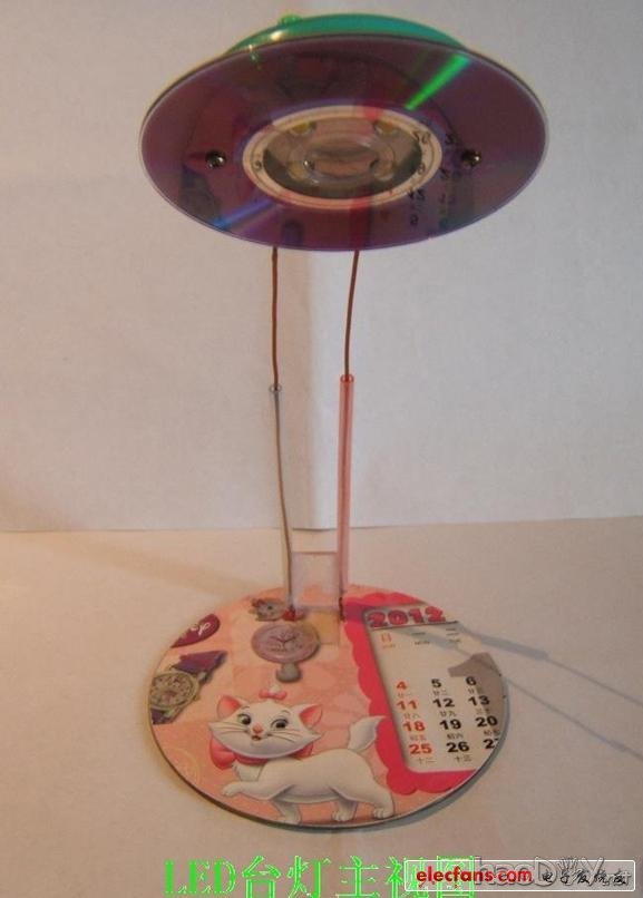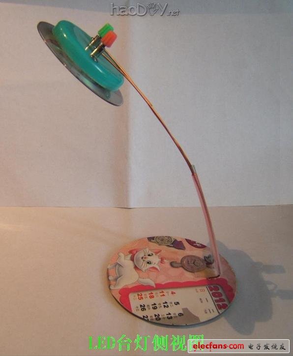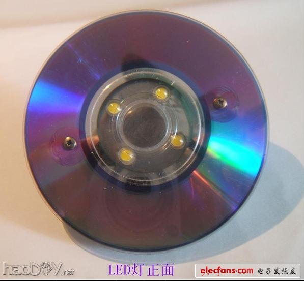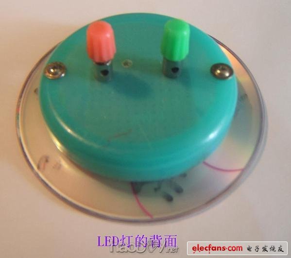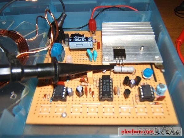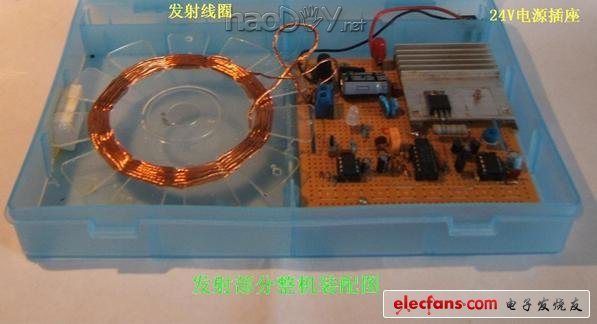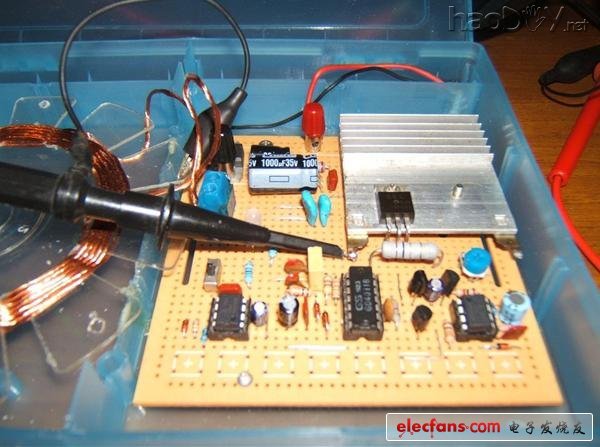 如果不测试接收距离和检测系统的转换效率,也可不装图2b的电路。 零件选择 无线供电的效率与发射级的工作状态有关,同时也与作为发射电磁能量的线圈的质量也有非常密切的关系,所以发射线圈L1我采用36×Φ0.1mm的李兹线,绕在用光盘作骨架的蛛网板上。见图3: 线圈的骨架用光盘制作,为了避免涡流损失,光盘上的金属镀层应当去掉。骨架的内径为66mm,用36股Φ0.1的漆包线绕11匝。图2b中的接收线圈也绕成蛛网式,用24股Φ0.1的多股漆包线绕8匝。 #p#分页标题#e# 高频输出级用大功率场效应管,如IRF系列的634、630均可,或其它耐压200V,电流5A,最大损耗功率大于20W以上的VMOS管。使用时需加上面积足够大的散热器。 谐振电容C4要求用绦纶电容,耐压200V以上;C11、C12、C13、C14要求耐压35V以上。定时电容C5、C10要求容量准确,漏电较小,最好用钽电容,如果没有钽电容则应采用耐压25V以上的铝电解。C7、C8、C11、C12要紧靠IC4焊接。 其他元件没有什么特殊要求。 调试与安装 先调发射部分。输入24V的直流电源,当调试开关处在断开状态时,LED的红灯会以大约1秒的周期闪亮,这说明IC2工作正常。合上图2a中的调试开关SA,使振荡部分连续工作,这时红灯将一直点亮。检查各点的直流工作点是否正常,这时整机电流约50mA,其中VT3的漏极电流约20mA左右。如果24V和9V两点的电压正常,可用示波器检查各关键点的波形。 当各点波形基本正常后,用一个2200pF的绦纶电容(耐压250V)和一个1000pF的可变(可用多连可变并联而成),仔细调整可变使整机电流最小。量出并联的总电容,将一个或数个并联的固定的等效电容替换原来的固定和可变电容,并在线路板上焊好。 断开维修开关SA使振荡器工作于间歇状态;旋转Rp到最大使LED绿灯亮,逐渐将Rp减小,使得LED的绿灯熄灭,红灯刚好闪亮。这时整机电流在10~20mA间摆动。 将接收部分靠近发射线圈,断开接收部分的负载开关SA,则接收器上的指示灯LED会和发射部分的LED同步闪亮。同样,用一个0.01μF左右的固定电容接到谐振线圈的两端,逐步拉开发射线圈和接收线圈的距离,同时适当增减谐振电容的大小使指示灯最亮。调整好后,将电容固定下来,在线路板上焊好。如果用示波器观察谐振回路的波形,应该可以看到与发射线圈频率相同的正弦波。 合上负载开关SA(图2 b),将接收线圈置于发射线圈正上方的5~10mm处,这时发射部分的双色LED的绿灯会自动点亮,说明发射部分己检测到负载,并工作在连续状态。如果再次移去接收线圈,绿灯随即自动熄灭,红灯再次闪动,说明智能部分的检测功能正常。如果检测功能不正常,应仔细调整Rp。 当电路检测到负载时,发射部分的总电流约200~300mA,视负载轻重而变。 无线供电台灯 电路和图2b基本相同,只是将作为假负载的50Ω电阻换成了4只串联的大功率LED。接收线圈用Φ1.2mm或更粗的漆包线做成圆盘状的线圈,其内径为67mm绕8匝,两端各留25cm的引出线,将来就作为小台灯的支架。 找一个光盘,去掉金属镀层,在适当地方钻两个小孔,将绕好的线圈引线穿过光盘上的小孔,并将线圈粘合在光盘上。 将4个1W的LED装在自制的散热器上。 另找一个直径80mm的小光盘(不必去膜)和一个大小适当的塑料瓶盖,作为制作台灯的灯罩的原材料。 制作过程见下面系列图片。 发射板元件面