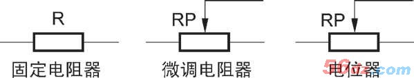 图9 WH15-K型带开关电位器 通过塑料拨轮盘控制旋柄转动,从而完成电源开关和阻值改变两项工作。电阻器的使用 1. 在电路图中的识别 图10中画出了固定电阻器、微调电阻器与电位器的电路符号。符号中的长方块,表示电阻体本身,两端的短线表示电阻器的两个引脚线。微调电阻器和电位器符号中带箭头的引线,表示滑动簧片端。在电路图中,为了整齐、清楚,这些电路符号可以竖着画,也可以横着画。在图中的位置也以连接简捷为前提。这与制作时它们的实际位置,竖放还是横放,以及排列的远近疏密都没有关系。这一点对电阻器以外的其他元器件也是一样的,请初学者注意。#p#分页标题#e#