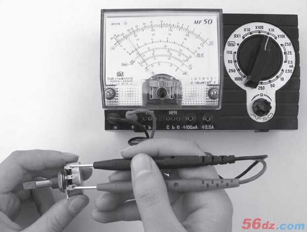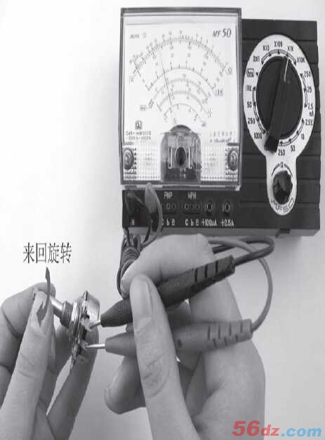 图10 电阻器的符号 通常情况下,如果一个电阻器在电路符号中或文字叙述中没有其他特别的说明,则可认为选择该电阻器时对型号、种类以及功率等均无特别要求。 2. 检测与修复 电阻器在使用前,最好用万用表进行简单检测,以做到心中有数。检测 普通电阻器的好坏,主要是用万用表测它的阻值。正常情况下,万用表的读数应与标称阻值大体符合;如果万用表的读数与标称阻值相差很大,或万用表指针不动、指针摆动不稳,则说明该电阻器已经损坏。这里需要注意,不能用两只手同时接触万用表的表笔两端去测量电阻值,因为这样会把人体电阻与被测电阻并联,从而造成测量误差。这在测高值电阻器时尤需注意。 检测电位器或微调电阻器的质量好坏时,可分两步进行:首先,测量电位器的最大阻值。按照图11(a)所示,将万用表的表笔跨接在电位器两固定端,测量一下电位器的最大阻值,其读数应为电位器的标称阻值。如果万用表指针不动或阻值相差很多,则表明被测电位器已损坏。然后,测量电位器滑动片与电阻体接触是否良好。按照图11(b)所示,将万用表的表笔分别接在活动端和一个固定端,同时缓慢地旋转电位器的旋轴,从一个极端转至另一个极端,反复调两次,万用表测出的阻值应在“0”和标称阻值之间变化。如果在电位器旋轴转动过程中,万用表的表针有跳动现象,说明可变触点接触不良,这样的电位器不宜使用。固定电阻器价格便宜,如发生断裂、变值、引线松脱而损坏时,一般应丢弃。微调电阻器常因日久积尘或锈蚀而造成接触不良,如发现测量阻值变大或开路,可用酒精棉球擦洗,或调整簧片压力,一般可以修复。
