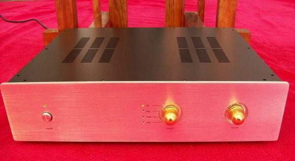 选用500W环形变压器,小R型变压器。大型扬声器插座、RCA插座,ALPS蓝壳电位器。机箱使用239机箱加工而成,在其面板多开4个音源指示孔。