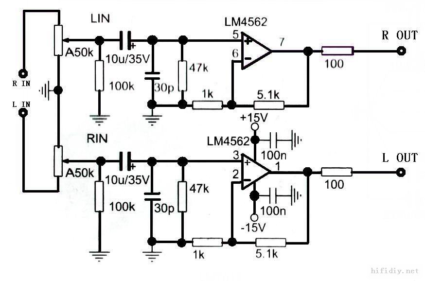 经过选择电路、电位器后,由LM4562组成一个典型的正相放大器,放大倍数约为6.1倍。电路的性能主要取决于超低失真,超低噪声的LM4562与周边的高品质元件。