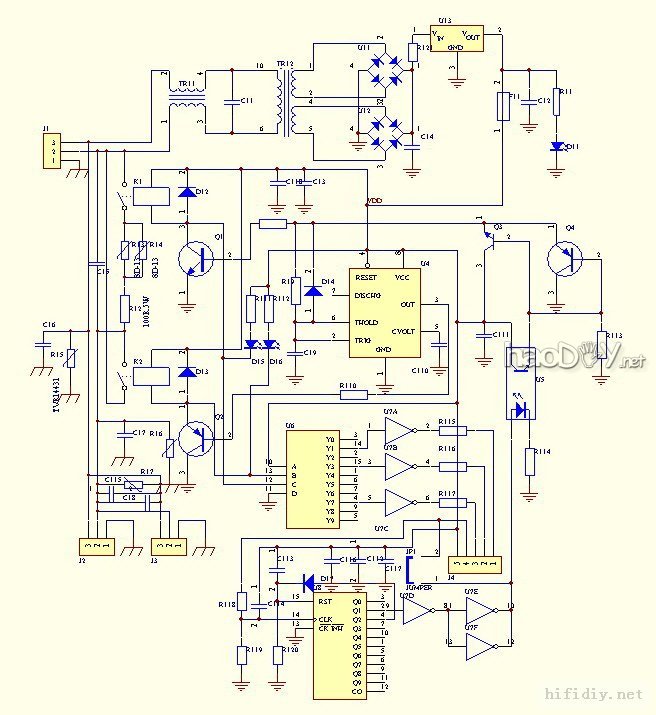 (1)电源控制板主要有主电源缓冲软启动控制、开关机控制、静音控制、后级电源整流滤波几个部分组成。电源主要控制原理图如下,待机电源变压器采用4.5W的德国BLOCK小型焊板式变压器,经稳压12V后给控制部分供电。主电源缓冲部分采用2只热敏与电阻(德国ATE 100W/30W)串联工作效果很好,并且选用上好的压敏电阻和电容用以吸收电网的冲击。选用台湾GOODSKY 12V/30A镀银触点继电器保证工作可靠性。电源开关部分采用CD4017组成的稳定电路,其中那个主电源触摸开关则废了我不少心思,原来定来的这只开关(单只45元)只有一个颜色,因为我需要3种颜色来指示电源状态,所以破坏性拆掉重新搞的效果相当不错,外观也很酷。