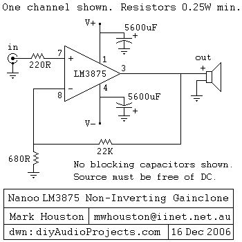 照片02:Nanoo放大器一看的图像显示,这是多么小的放大器。这个盒子尺寸为119 X 94 X 34毫米。它坐落在你的手掌和两个音量衰减器,超大垫实心黄铜隔离的脚,镀金重型扬声器端子,镀金输入插孔,纯银(99.99%)的信号路径,5600UF滤波电容的接线和重型铜导线连接到扬声器端子。图所示,在图01示意性了The Nanoo的。 图01:原理图 - LM3875非反相Gainclone的放大器所有的接线,这点对点的LM3875 gainclone使用面包板是类似的。因此,冷却不是最佳的,该芯片是用螺栓固定的情况下的侧面。该放大器都配有一个RSR232接收功率从远程电源插头。脐带是提供地球上的四根电线的两个重型。铁氧体电抗器上的电源线是用来减少任何杂散进入放大器的EMI。该放大器可以坐在压铸PS的情况下,坐在厚的硅脚。