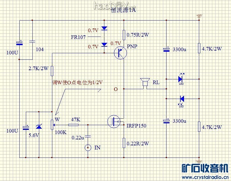 这是我的最新制作, 具有恒流源负载的场效应甲类功放,电路简洁,音色优美,效果类同1969。该机恒流电流为1A,电源电压30V,一路功耗30W。该机输出处设了二只反并联的LED,作用1、可以快速调整中点电压,2、平时使用时可以监视输出的中点电压是否偏高或偏低。该机可以使用的场效应管子很多,推荐IRFP150,2SK413等等。如觉的增益不够可以加一级小功率场效应管前级
