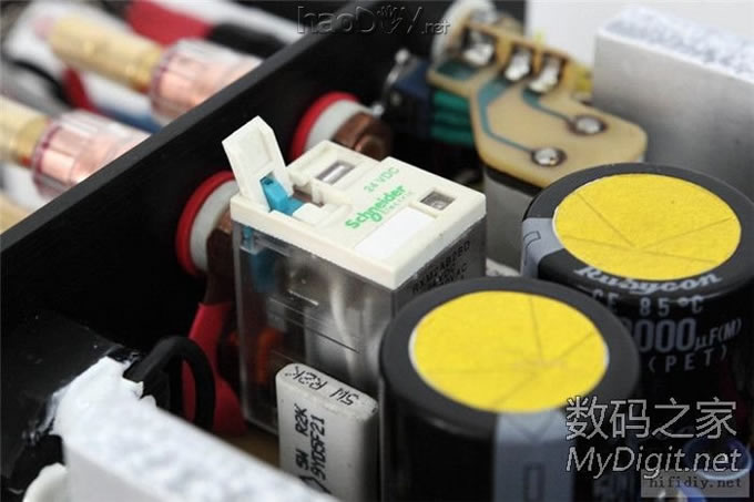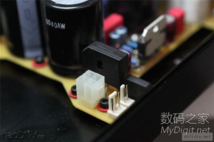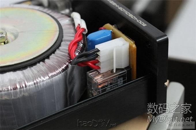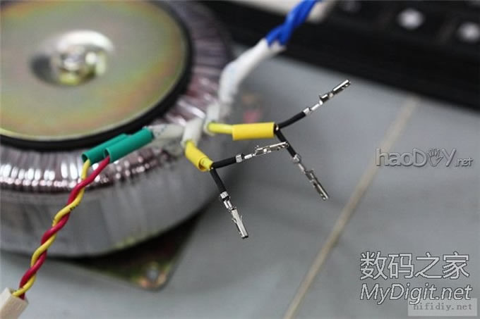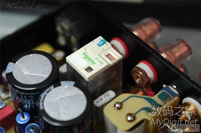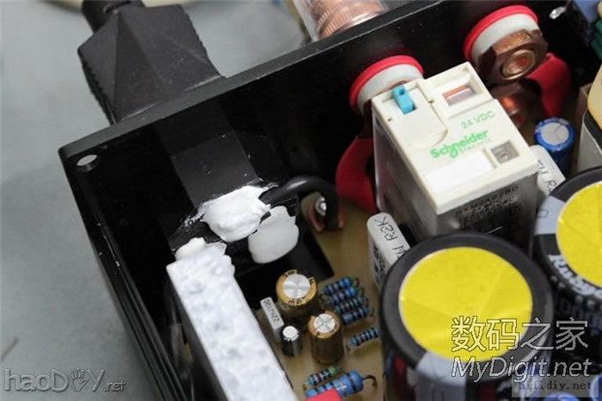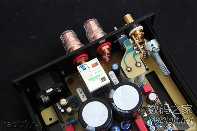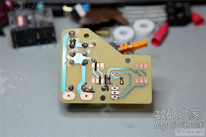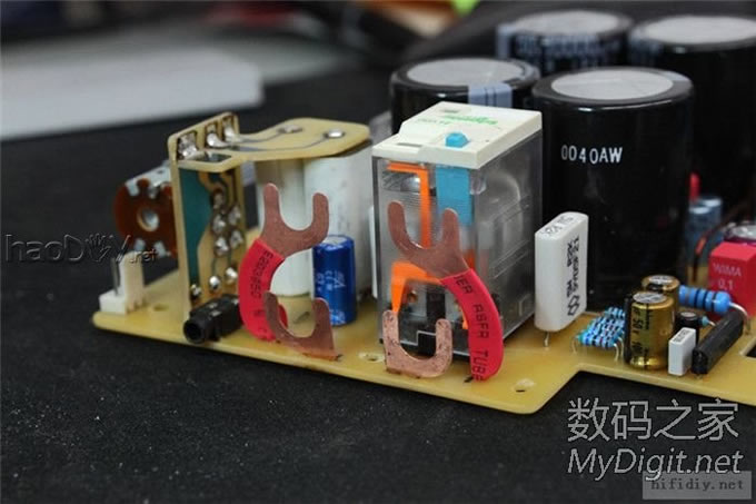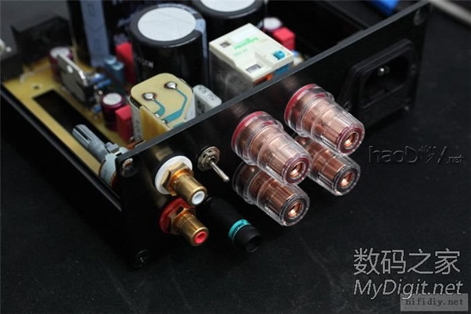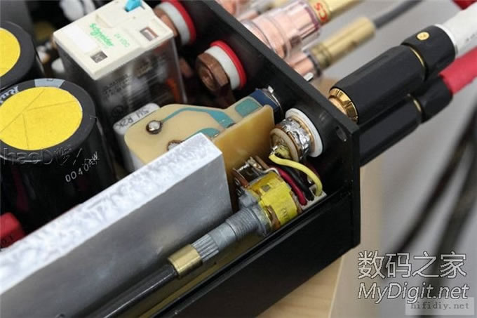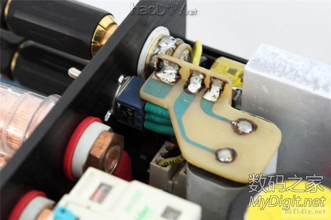 电源输入线也一样,要绞和 电位器快贴在机壳上了,所以也用高温胶带贴一下。两个RCA座用粗铜丝绕一圈后焊死,防止打转。   这是手动音源切换的开关,刚好在原来焊继电器的位置焊上两个3针插座连接。  接地位置,采用的是直接接地。电源插座是焊接出线,然后用硅胶密封了一下。