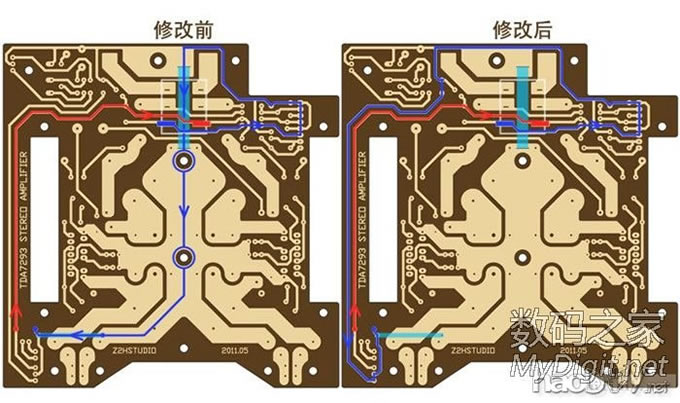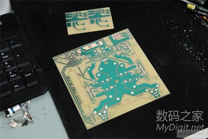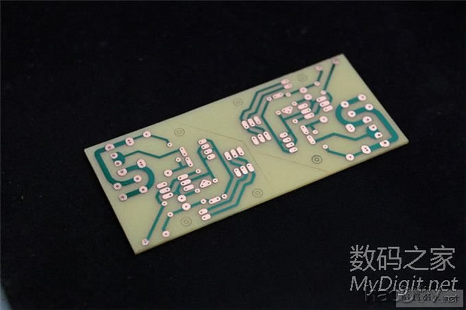 | 笔者从小学4年级就开始鼓捣电路之类,直到现在,人虽然不算老吧,但一直处于菜鸟状态。来hifidiy论坛三年,在交流中学到了很多经验,不过对电路结构、调试之类了解的仍然不是很透彻,略懂皮毛。 从厚膜玩到集成IC,刚刚达到照图做能响的水平。至于调音测试之类,时间、精力、金钱上都不太可能做得很完善。分立元件对我来说诱惑很大,小功率的应该可以,但那种大动干戈的牛机,恐怕真是难以折腾了。看到本次大赛的主题是“功放DIY”,刚好又有朋友要我帮着做一台接电脑用的桌面功放,老婆大人也整天吵吵要一台不裸奔的功放,于是就一起做了两套。   基本就是官方电路,只是输入耦合个人认为2-3uF比较好听。图中所有元件参数都是最终实际参数。朋友要求有两组输入可以切换,所以加了个信号切换继电器。电源部分的开关设计在此先感谢“低音巴松 ”、“shinyue ”、SHILKA “等坛友帮助出主意。 高手们估计是都看腻了什么3886、7293之流,不过,对刚接触音响的新手们来说,这篇制作应该会有一定的帮助!既然定位在桌面功放,接电脑用,必然也就是推一推书架箱,功率要求也不是很大,而且发热量要控制得住。我对7293IC的使用有一定的把握,所以这次就用它啦。 从电路开始。有了完整电路图,就该布置元件和走线了。   机箱在网上买了俩,外观比较朴素。想要放大点的牛又不想把电位器的线弄得很长,只好设计电位器延长方案。   先测量所有元件的外形和引脚尺寸,然后布网格,画PCB图。   打算继续用单面感光板来做,IC引脚处有另外一小块反过来做集中跳线,方便布线。机箱也是实际测量建模,所以各元件的装配关系很明了,也方便后期加工。唯一需要定制的就是牛和两个IC的导热板。散热完全靠机箱本身,这种是第一次尝试。(后来测试问题不大)     细节。布局很紧凑,比较担心的问题就是散热,还有牛会产生干扰。     完成后基本外观,很朴素。最后出来的PCB,一点接地,单面板难度较大,最后基本上搞成总线式接地了。   这里再唠叨一遍感光板的用法给新手参考: 拿激光打印机打印胶片(打了N多张,有的板子反了,有的字反了,有的打花了),选出两套,要求叠在一起保证基本不透光。放在两个荧光台灯下曝光15分钟。(曝光时间和光强、距离,甚至感光板生产日期都有关系,使用前最好先裁一小块测试一下)   由于上次的感光板整个用洗板水洗过,把感光膜都洗掉了,又不太会涂绿油,结果铜箔不久就发暗氧化了。这次动脑筋,研究了个新方法进行二次曝光,做出焊盘。(不做焊盘的话,感光膜有一定的阻焊作用,不好焊) 方法很简单:第一次晒好电路后,蚀刻的时候避光进行,这样蚀刻完感光膜仍然有效。然后再次用画好的焊盘胶片来曝光,最后进显影液显影就OK了!   小板曝光中。两块压板就是这次要用的机箱面板。   玻璃板一定要压实,不然线路会模糊。   快好的时候会看到颜色会从淡绿色变成蓝绿色。(过曝也不好,线路上会有很多麻点,除非你的胶片打印的足够黑)   晒小板焊盘。蚀刻用的是“蓝色环保蚀刻剂”常温下腐蚀了将近1小时。(试过增加浓度,结果铜箔变成花花绿绿的,而且不再继续反映,应该是钝化了)   最后完成的板子。   由于感光膜的保护,不涂绿油也不会担心氧化问题了。(不过要注意,感光膜比较薄,不耐划,制作中要小心保护)   电路板做好后,就要进行打孔了,老婆非要试试,结果,有几个眼打偏了...   打完孔,裁完边。掏孔用的是叟弓,也叫曲线锯。直边直接用的钢锯。最后用小锉刀将边缘打磨光滑,并且倒角。   可以看出,先做的那块大板子的颜色已经变的更蓝了。   陆陆续续往上焊零件。元件基本都是网购的,很多都是二手拆机件。威玛、飞利浦应该都是真的,比较怀疑的是ELNA。电阻就是普通国产金属膜。右边用0.5mm的铜皮做了地线的跳线,从继电器肚皮底下穿过去。   小元件差不多都焊完了。     准备上主滤波。一般常规的是30*50mm,机箱装不下。所以费劲找了体积比较特别的红宝石,30*40mm。外观上看,应该是真的吧,新一批顶部没有绝缘帽,直接一K形口。 高手们估计是都看腻了什么3886、7293之流,不过,对刚接触音响的新手们来说,这篇制作应该会有一定的帮助!  既然定位在桌面功放,接电脑用,必然也就是推一推书架箱,功率要求也不是很大,而且发热量要控制得住。我对7293IC的使用有一定的把握,所以这次就用它啦。 电路采用的基本就是官方电路,只是输入耦合个人认为2-3uF比较好听。朋友要求有两组输入可以切换,所以加了个信号切换继电器。 前面说过了,我的焊工烂,又不能用洗板水。【查看前文】(后来发现,焊点不圆滑和焊锡质量有很大关系,前一卷焊锡用完了,换了另一个牌子,感觉超级好用,流动性和光泽度都不错)  期间单独测试了喇叭保护电路,工作正常,3秒吸合。但整机测试时发现有极大的交流嗡声,后来发现是保护电路的地线走的不合理:最开始是从整流出来,正电源从板子侧边走到pc1237,负电源是用跳线直接连在放大电路的地线上,这样形成了一个大的电流环。不得已,将负电源改为借用原来给信号切换继电器供电的线路,从侧边走,这下噪音全无。 由于PCB与导热块之间有点间隙,用0.8的铜板做了个匀热。铜板用钢锯裁好尺寸,用1000号水砂纸加水打磨。然后在电路板蚀刻液里稍稍腐蚀了1分钟,出来就变成这种沙金质感了。   导热块是定制的,