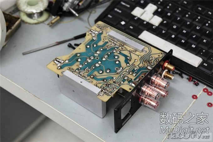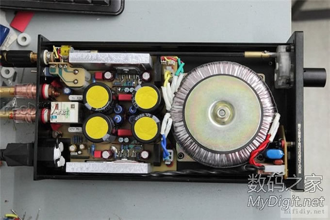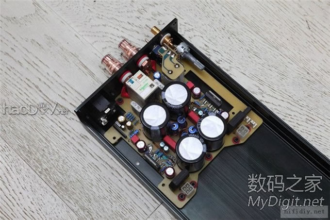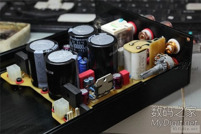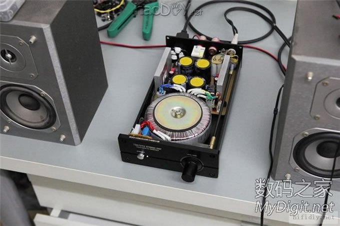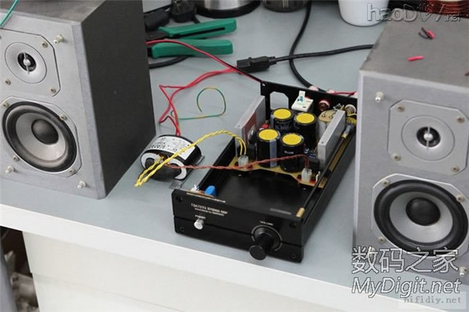 最后来张内部布局 整体通电,还好,没烟花。噪音控制的还可以,贴在喇叭上有一点点交流哼声,离开几厘米就听不到了。应该是牛挨得太近的缘故,可惜没有合适的牛罩。  一般音量工作半小时,表面最热处的温度。(北京最近不是很热,室温大概26度)  接线。自制的线材。正式试音:  空间:15平书房,木地板+中间一块地毯,后背整墙书架,左侧厚落地窗帘。 音源:创新X-FI MUSIC 声卡(0460),win7 64bit 官方驱动 音箱:天朗S8LR,8寸同轴信号线:自制,佳耐美4芯屏蔽线 + 雅宝GY-3.5GB插头 + 雅宝RCA-007GB插头(2.5米) 喇叭线:自制,雅宝GY-180A + SC:03B-L香蕉头(1.8米X2)(另一对怪兽线 + 百威头)#p#分页标题#e# 电源线:电脑用普通3芯线 媒体:无损压缩音轨,FOOBAR 2000 + 终极解码2011  没有选特定的试音曲目,电子贝多芬最后一轨,1812真实炮声版,老虎鱼的第一张专辑第7轨,还有很多爵士乐和流行乐。总的来说,就是7923的声音,高频解析还可以,中频很暖,这可能和号角单元也有关系,低频下潜不错,但力度不是很大,属于比较柔和的类型。  |