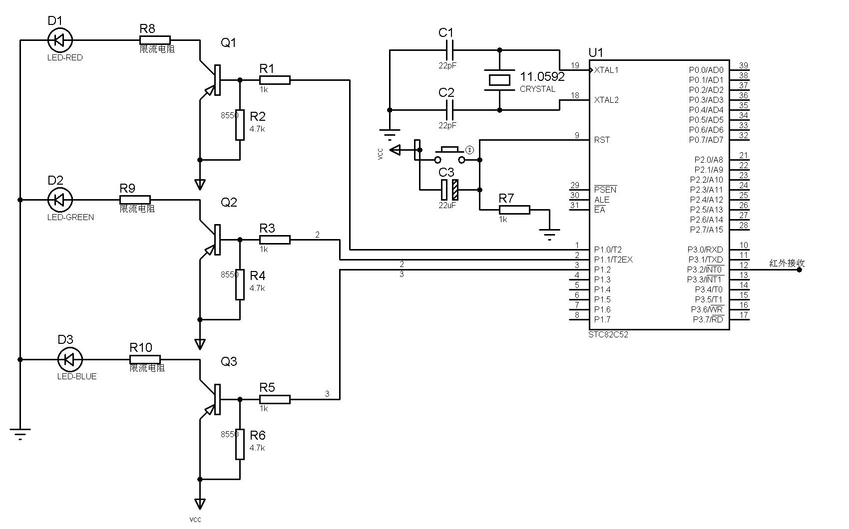 2红外接收部分,我在protes中没找到三个管脚的红外接收器件,就干脆用了环宇电子提供的原理图,就是大部分单片机开发配有的红外实验套件。 ![]()