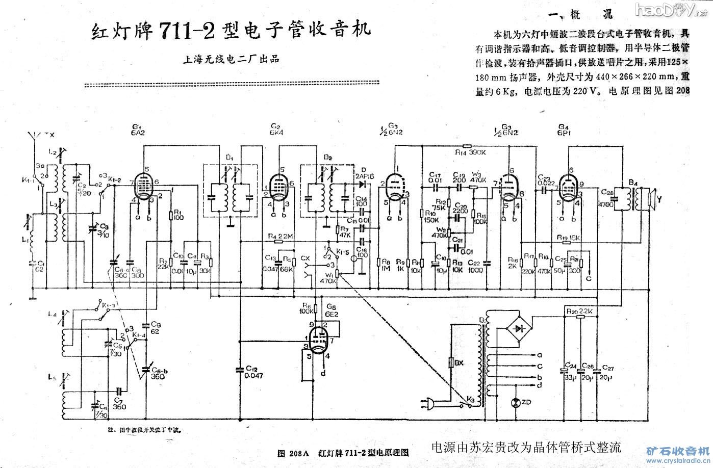矿坛举行第一届DIY作品比赛,我左看右看还没有矿友发帖,为积极响应矿坛的号召,我就先来一个献丑了。 自2005年2月注册矿坛之后,就激发了我已沉寂了20多年的DIY机热情,2005年8月就DIY了这台《红灯》711电子管收音机。在DIY 该机时由于没有6Z4,再加上自制的电源变压器的窗口小,不能绕下双200V输出绕组,所以采用了晶体管桥式整流。此机完工后几经改造,主要是更换了磁性天线,二是增加了刻度盘调谐系统。整个DIY机过程如下