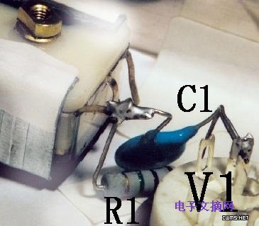 将电阻R1的引脚弯成图示形状,电阻紧贴机壳,引线在与可变电容定片齐高处弯一个小圈,套在定片上,电容C1亦穿过小圈,焊在一起,而R1 C1的另一端则穿进V1管座的②脚焊牢。此时的R1实际成了支撑可变电容定片的支架。