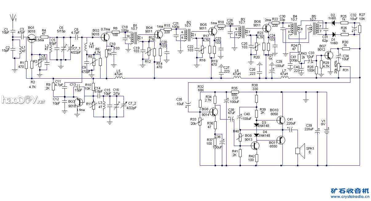 1、绘制电路图:电路图采用常用电路,高频头和中放采用苏老师曾经采用过的电路,一级高放、独立本振、两级中放,功放电路采用元珍老师《高灵敏宽频响丑机》中的otl电路,我用软件进行重新绘制,软件采用“CircuitMaker 2000”电路图如下:
