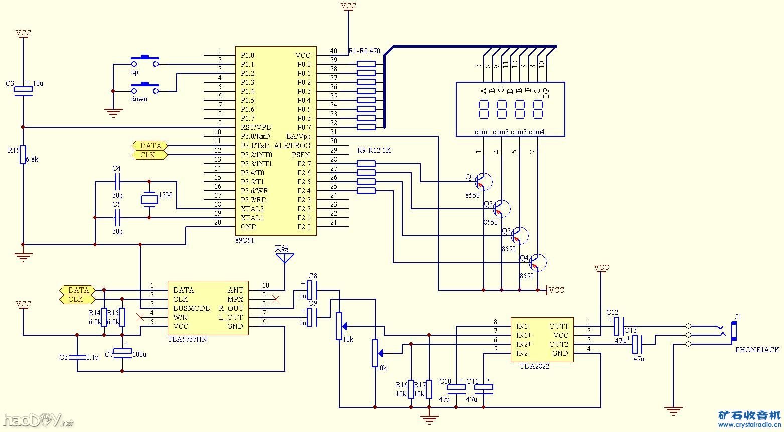 手头有2块TEA5767收音模块,最近在家没事于是制作了一台单片机控制的收音机。(注:相机的时间没有调整) 以下是显示部分,用4位共阳数码管,原理图上的管脚定义是经过测试得出的,如果采用不同的数码管,管脚定义可能会不同。 收音部分采用TEA5767,网上能