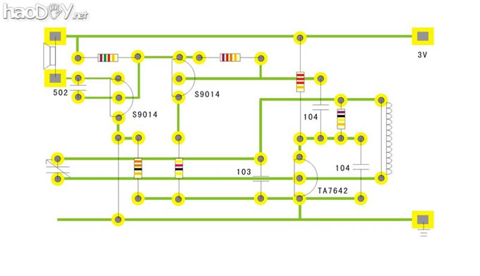 为的配合咱们坛子一年一度的大赛盛事,又做了一个简单的收音机,请高手们指点。。![]() 磁棒天线两脚用的是杜邦针用胶枪固定直接焊在电路板上的。 ![]() 再来个特写 ![]() 电路图是自己用CorelDRAW 12画的,想做的朋友可直接打印做电路板,不过我用的是洞洞板,省事哈。。。 ![]() 每个元件都标的有参数啊,,色环电阻自己算阻值。 (责任编辑:admin) |