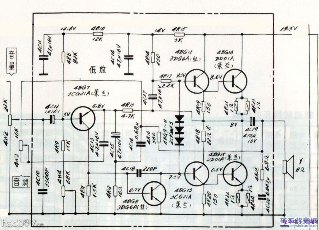 DIY一台调频调幅收音机是我一直未了的心愿,通过查找资料和器件的准备,现在终于可以开工了。该机的最终结构是:一共四个波段,其中有调频一个波段、中波一个波段、短波两个波段。调频部分的图纸是《无线电》82年第一期由中夏老师的设计的电路图,中波和短波是采用《春雷》605电路,功放采用原飞跃12D1黑白电视机的OTL电路,由于我对调谐指示6E1情有独钟,故在晶体管机中采用电子管6E1作调谐指示,电源牛输出电压准备分别设计为200v、12v、9v、6v各一组,分别给6E1、功放、主板、指示灯供电,底盘准备采用镀锌板制作,机壳准备自己画图后给家具厂制作。调频调谐器的组装和调试 (中夏) 调频收音机通常是和调幅收音机合装在一起的,调频部分只作为一个波段,低放及中放管可以合用,工厂都按这种格式生产,原因是为了节省材料降低成本。业余制作者可以不必拘于这个格式。如果已经有了调幅收音机,再装制一个独立的调频调谐器,使用原来调幅机的低放,就可以收听调频广播了。制做独立的调频调谐器比调频、调幅合装在一起容易调试,易于成功。由于普通调频收音机的电路已经典型化了,除非高档机增加一些特殊功能外,一般没有什么特别的地方。但要装好调频机,关键在于元器件的选用、组装和调试。这里以一个简单的调频调谐器为例,介绍一下元件的选用原则,组装调试方法。 调频调谐器的电路:调频头使用三只管子,BG1作高放,BG2作本振,BG3作混频。BG4、BG5作中频放大,BG6为鉴频放大器。BG7是射极输出器,便于与后级连接。调频头的线圈很容易制作。L1~L4电感量均小于1微亨,用φ0.6~1毫米漆包线绕成直径为φ5~φ6毫米的空芯线圈。各线圈数据已标在图中。调试时拨动线匝之间的距离即可改变其电感量。10.7兆赫中频变压器B1、B2、B3及鉴频线圈B4、B5的骨架、磁芯、磁帽、外罩等均可用调幅机短振线圈改制。圈数标在图1中。各线圈均用φ0.1~φ0.13漆包线,先绕次级后绕初级,抽头顺序可根据印制电路板编排。其中B5的两个7圈要双线并绕;B5中的1圈不需要交叉,实际只有半圈。考虑到超高频频段的介质损耗,调频头部分的电容器最好选用高频瓷介电容,金属纸介及涤沦电容均不适用。旁路电容C4、C14等选用1000微微法以上均可,为统一方便都使用了0.01微法。可变电容器最好使用调频机专用的3~19微微法空气电容,或调频调幅机上用的复合四联可变电容器(只用4~24微微法的调频部分)。调幅机上用的2×270微微法双连串接一只20~30微微法固定电容也可用。半可变电容最好选用小型瓷介微调电容(CWT型)。电阻仍可使用一般小型炭膜电阻。 晶体管的fT一般要比实际工作频率高5倍以上,因此调频头的三只管子fT要大于500兆赫,但混频管BG3的fT可以低一些。此外高放三极管BG1还要求噪声低。现在,国产专为调频收音机设计的高频管是3DG204,(实际采用9018)类似的管子有3DG18C等。3DG30、3DG32B、3DG84C及3DG11B也可代用。中放级工作在10.7兆赫上,使用一般调幅机常用的3DG200系列即可。(实际采用9011) 印制板图:从图3可见,元件按照电路的顺序从左至右逐级排列(从右至左也行)。工作在超高频段的调频头部分各元件之间引线要短,以减小分布电容。因为在调幅波段可忽略的某些分布电容和分布电感到了超高频段往往有很大影响,造成交连或旁路,引起自激或降低增益。特别要注意地线,务必短而粗。可按图3采用大面积地线方式,这种方式地线导通良好,工作稳定。另外从图3可以注意到,双连电容把输入回路、高放级与混频、本振级隔离开。使得输入线圈、高放线圈与振荡线圈相互远离,减小了相互交连,使工作容易稳定。中频陷波器工作在10.7兆赫频率上,可装在混频管附近,与它串联的C12接地端应靠近C14的地端。 从中放级BG4开始逐级采用了按电路顺序通行的方式,而其中每级的地线是独立的,即每级放大器的基极、发射极旁路电容和集电极地端都在同一段独立的地线上,使每一级电流自成系统,前后级之间的电流不在公共部分交连,这种接地方法放大器工作最稳定。 该调谐器鉴频器音频输出部分的印刷板走线是根据低放电路供电的情况设计的。一般低放电路有两种供电形式:一种是供负电(即电池正极接地,这种情况低放部分使用锗管),另一种是供正电(即电池负极接地,这种情况低放部分使用硅管)。为了适应低放电路供电的不同方式,印刷板有三根走线(带斜线的)要根据具体情况联接。先假设低放电路电源正极接地,此时图1中的BG7用锗(PNP)管,R30焊在电路板RA(虚线)的位置,RB(虚线)的位置用导线短路。电路板中A1、A2两处用焊锡连起来,这样音频信号从a1(C39正极)和a2输出。如果低放部分是电池负极接地,图1中的BG7应改用硅(NPN)管,R27和R26位置互换,C36极性反接,局部电路参考图4(a、b)。此时R30焊在RB(虚线)的位置,RA(虚线)位置用导线短路。并且将P1、P2两处用焊锡短路,音频信号就从b1(C39负极)、b2(音频地)输出。由于C38极性只与D1、D2的方向有关,与电源正负极的接法无关,故不必更动。 调谐器组装完毕之后可与调幅收音机联接起来,调频与调幅波段可用波段开关控制转换。另外,由于调谐器末级是射极跟随器,故输出引线可以很长,而且不必用屏蔽线。联好之后先加上直流电源,将调谐器各管子工作电流调到图1所标数值,然后进行交流调试。用信号发生器调试的方法如下:将信号发生器输出一个等幅(未调